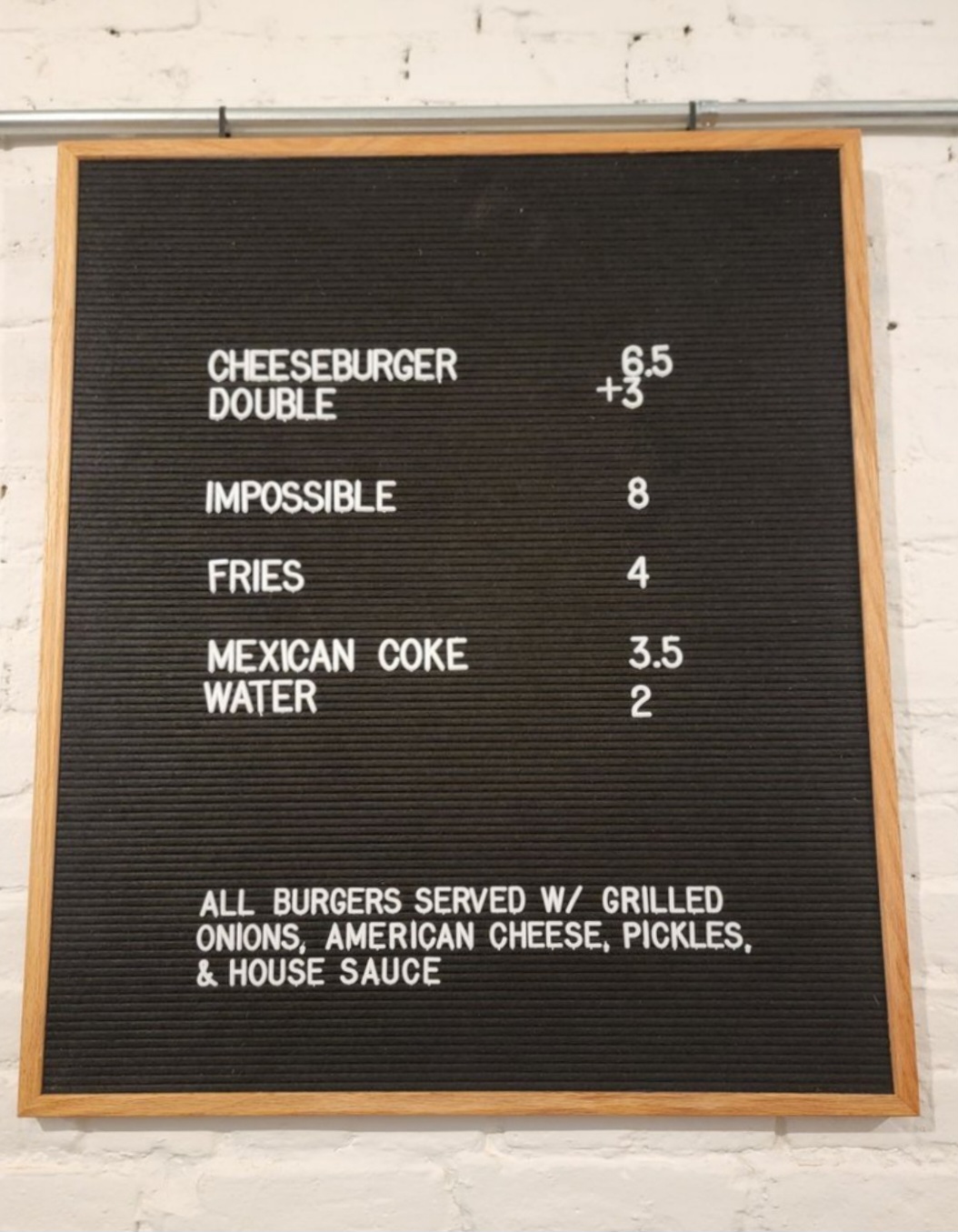 We went on a Friday evening and got there at about 6/6:15pm. The place is narrow, so it's best for take out or pick up orders, in my opinion. They have a small seating area for about four people up front and maybe two high tops where you can stand and eat. The menu is super simple: For food - a cheeseburger, double cheeseburger, impossible burger, and fries. To drink - Mexican coke and water The burger toppings are also listed, which are: grilled onions, American cheese, pickles, and house sauce. I did hear some people order loaded fries, but I have no idea exactly what comes on those (maybe it's a 7th street secret menu 🤔 lol). Our wait time was 15 to 20 minutes, and then the back end notified the front whenever the wait time increased so she could inform those placing orders. This is great, because you will have a realistic expectation of when you will be getting your food! They take your name for your order and call it out so you can make sure you get your correct order. While I waited, I didn't see anyone come back with discrepancies with their orders, so another plus! The place definitely got crowded, which I believe seems even more so because it's not huge, but the staff were great, and they knew how to handle it. They gave realistic wait times, and they were friendly during the entire time. It got a bit hectic, but they never looked frazzled at any point. It just looked like they were making things work for them. (There was even a Marco-Polo moment among them, which really cracked me up for some reason). And the tip bucket was cutely labeled "tips for college." I know that struggle (from going several times and from working in them) so tipped they were! I'd definitely return, but I'd just try to come at a less busier time if that's...