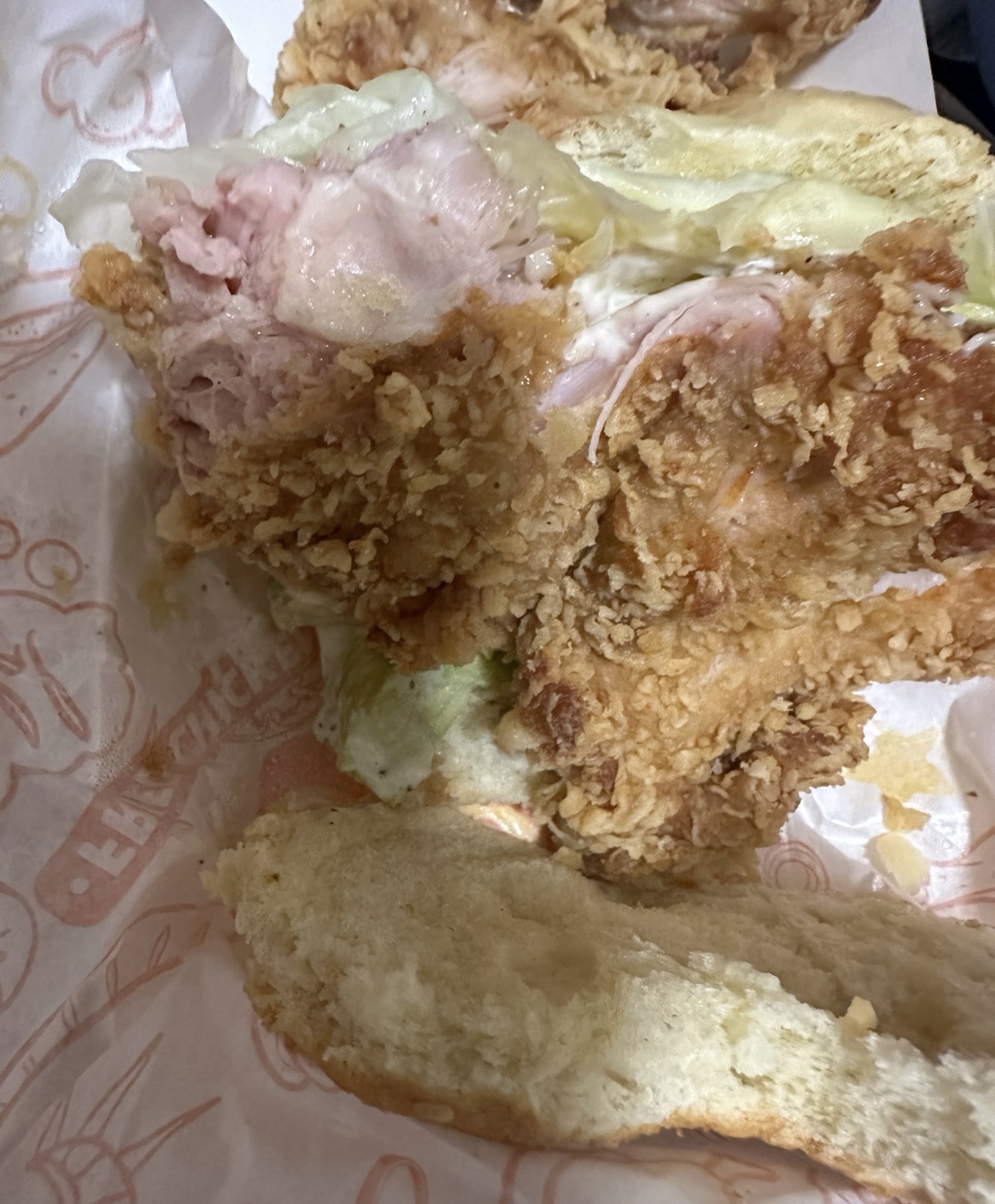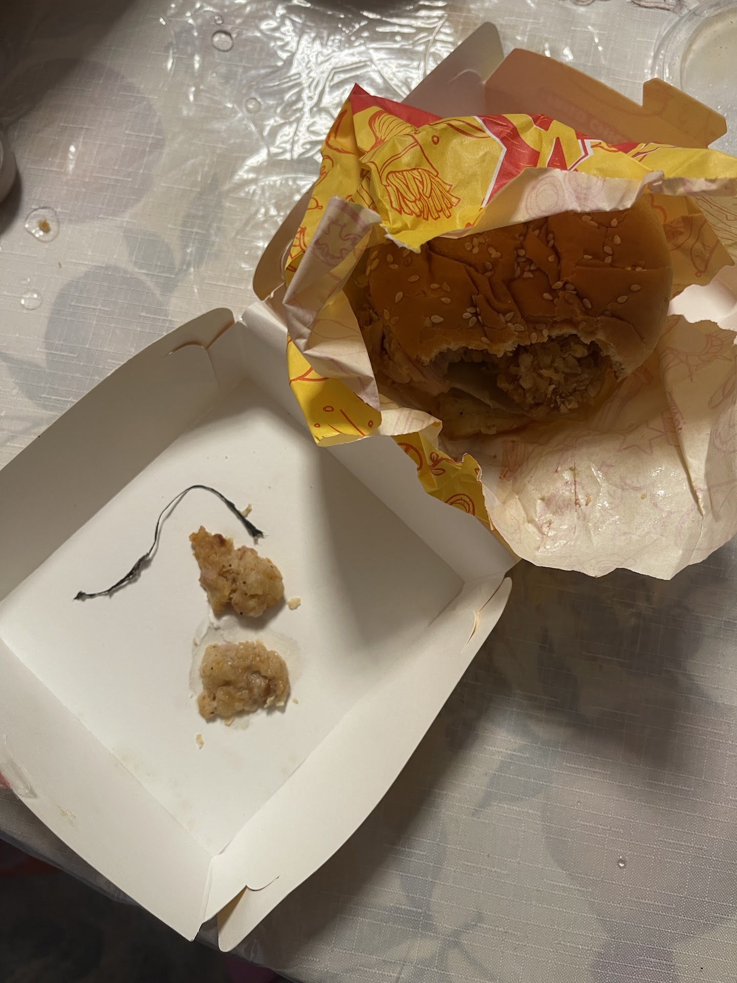 I am extremely disappointed and concerned about the hygiene standards at this place. While eating my chicken sandwich, I bit into something strange and discovered a long, thick black string embedded inside the chicken patty. This is not just gross. It is a serious choking hazard. I almost swallowed it before realizing what it was and had to pull it out from my throat.