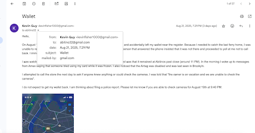 Read moreOn August 19th around 9:40 PM, I left my wallet next to the register while buying a slice. A few minutes later I called the store, but I was yelled at that it wasn’t there and was asked not to call back. Later that night, my wallet’s AirTag still showed it at the store until 11pm, past closing time, and the next morning the AirTag was disabled.