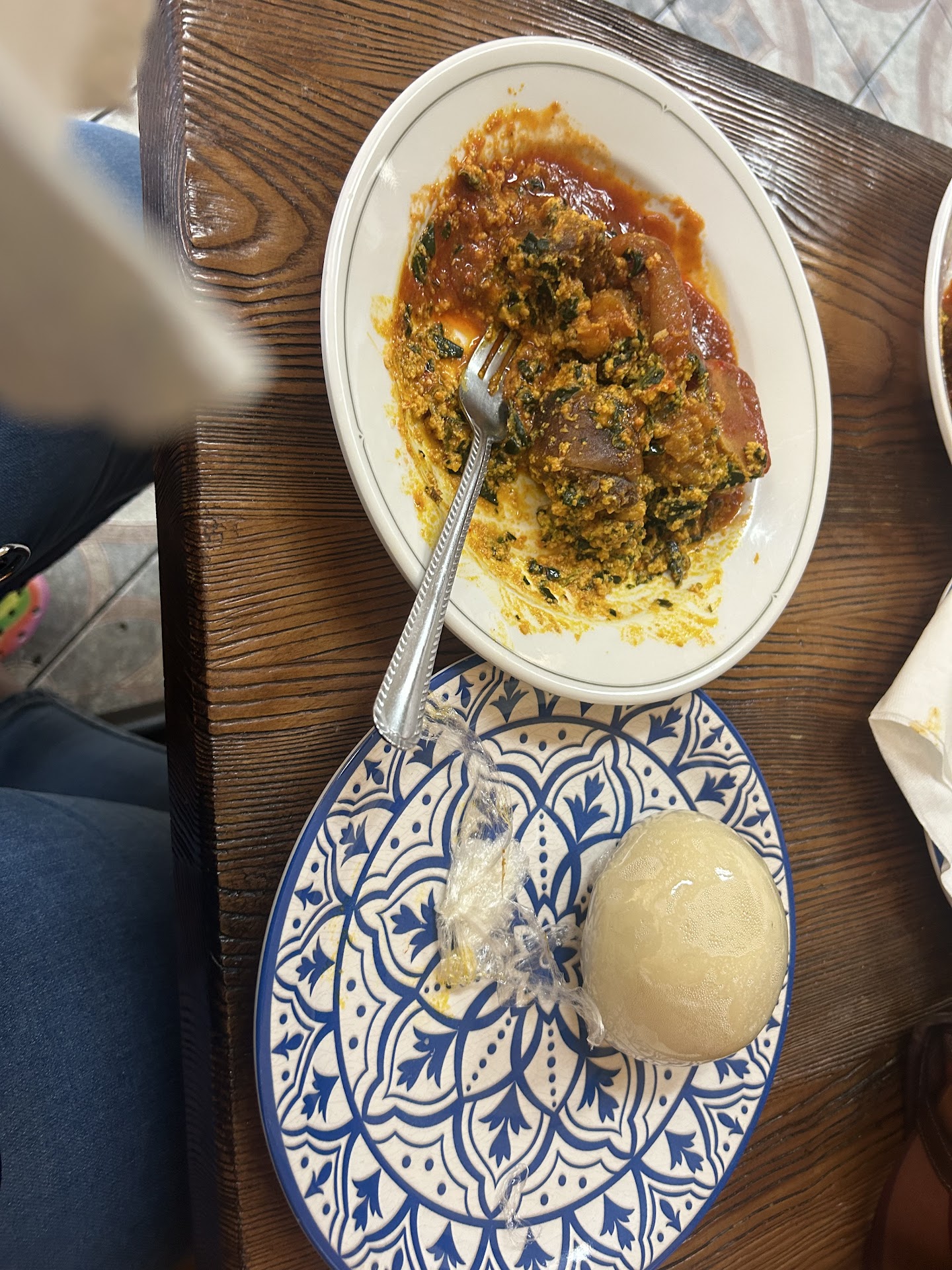 I showed up a few minutes after they opened. Ordered the egusi soup w/ pounded yam (dine in), and yam porridge w/ spinach instead of meat (to go). I also had a little ginger soda. My total came to $37. NYC is expensive (no surprise there).