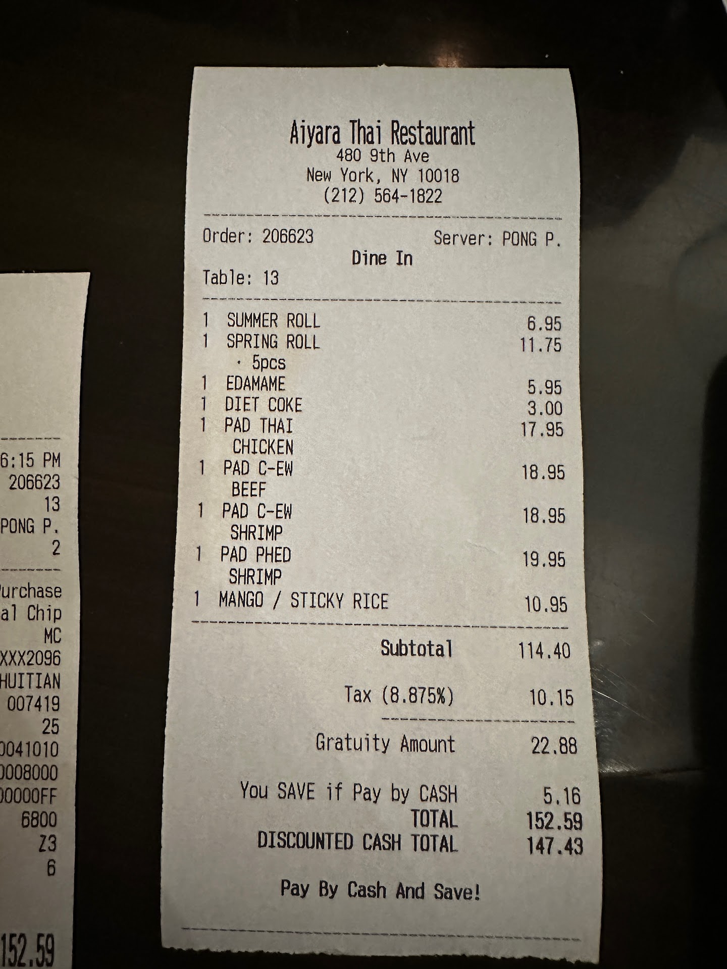 When we tried to split the bill among friends, we realized they had tricked us. The receipt showed a total of $152.59, a discounted cash total of $147.43, and a $5.16 cash saving. However, our food total, plus tax and the mandatory 20% tip, came to $147.43. This means that paying by credit card incurs an extra $5.16 charge, rather than a discount for paying cash.