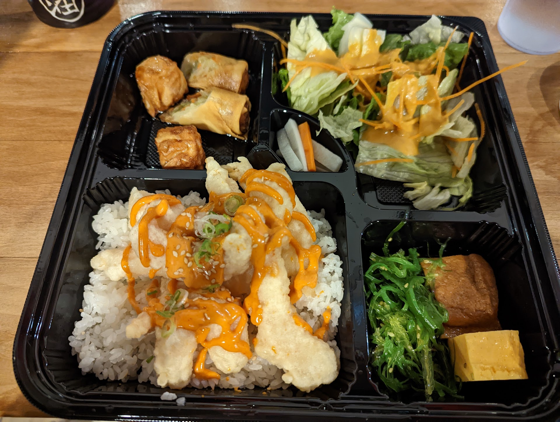 Their bento boxes are no longer on their menu, but they still made it for us when we mentioned seeing google reviews about the boxes. I got the shrimp bento box and really liked it! I tried a few bites of my friend's eel bento box and liked that one as well. The shrimp tasted freshly fried, and the eel was warm, tasty, and tender. The box came with a variety of food, including miso soup, lettuce salad, spring rolls, dumplings, rice, seaweed salad, tofu, and egg, and everything tasted great. The portion size was just right, and the bento box cost $20, which I found very reasonable by New...