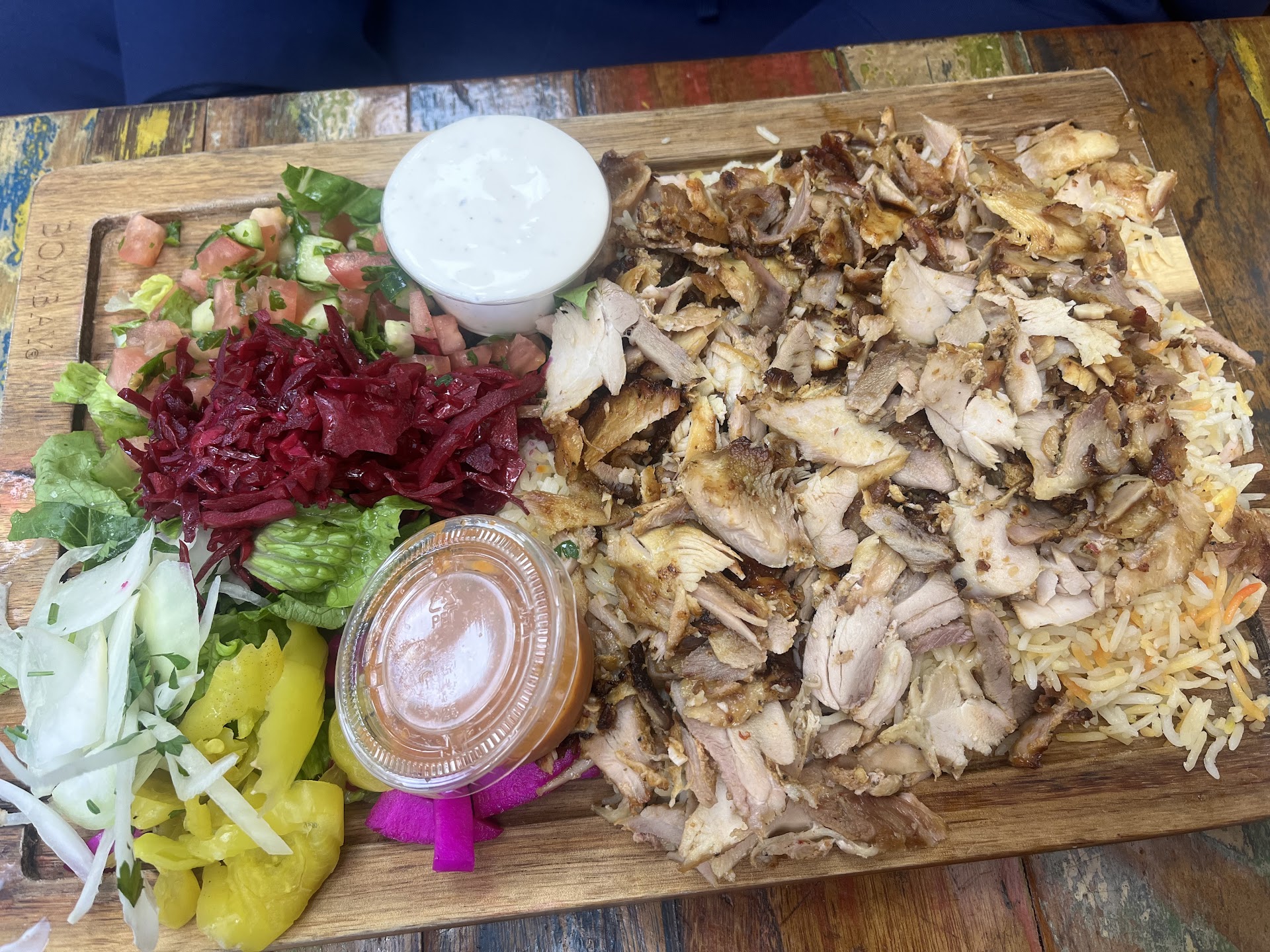 The food here is phenomenal. Today we had the chicken shish kebab wrap with pickles which was packed with tender, flavorful chicken and a perfect crunch. The lamb shawarma on pita was equally impressive, boasting rich, savory spices. We also had the beautifully presented falafel platter, which is the best I’ve had anywhere, ever.