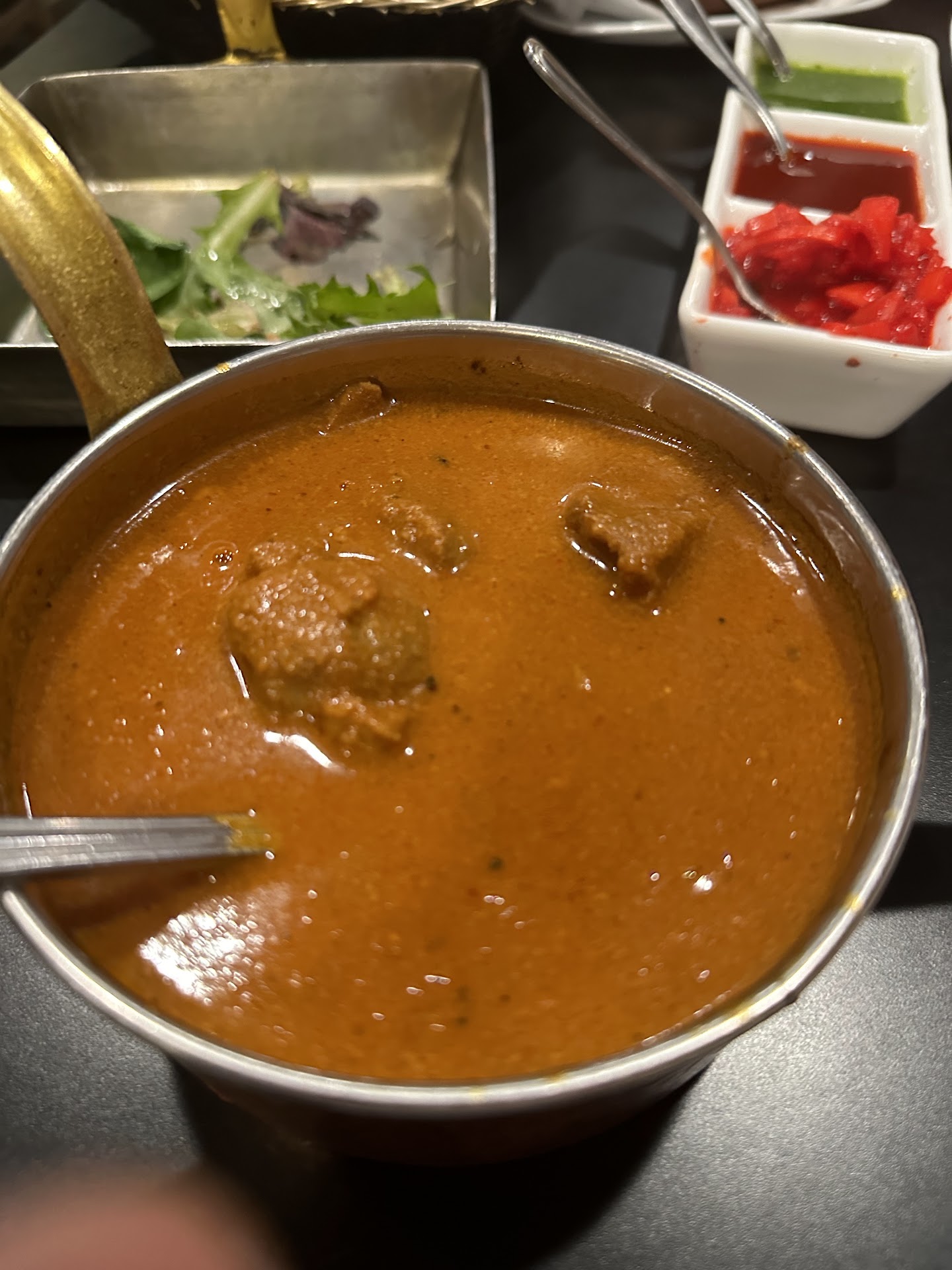 Saturday night around 7:30pm. Not too busy for me to sit in the makeshift extension put up during the pandemic. I ordered Mali Kofta and wonder what the heck I've been eating all these years! Like the first time I had real crab and could never eat fake crab again, I was amazed at how light in texture the dumplings were. Usually they are dense like Christmas fudge at their worst and spongy at their best. Not here. Light, crumbly inside with an almost cous cous texture. A bit of sweet. Usually Mali Kofta is in a tomato cream sauce. This was a light seasoned, creamy, tan sauce. I didn't think to ask. Thankfully it was not over salted! An experience I've not ever had before. The mixed vegetable pakora was ordered by mistake. I wanted something else but ordered this. It was a great mistake they were HOT, light, crispy and flavorful without being greasy or overly seasoned. The best part....I did not get that overly stuffed feeling and dreaded sugar crash an hour later like when I eat Indian food elsewhere. I'm sure glad I found this place. Only slight down side is the male staff kept talking to a regular, alone, female patron whose boyfriend went out "with the guys". The problem, she had a VERY LOUD, vocal fry with nasal thrown in with it that irritated my senses. But that's not the...
