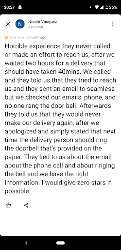 Horrible experience they never called, or made an effort to reach us, after we waited two hours for a delivery that should have taken 40mins. We called and they told us that they tried to reach us and they sent an email to seamless but we checked our emails, phone, and no one rang the door bell. Afterwards they told us that they would never make our delivery again, after we apologized and simply stated that next time the delivery person should ring the doorbell that’s provided on the paper. They lied to us about the email about the phone call and about ringing the bell and we have the right information. I would give zero stars...
