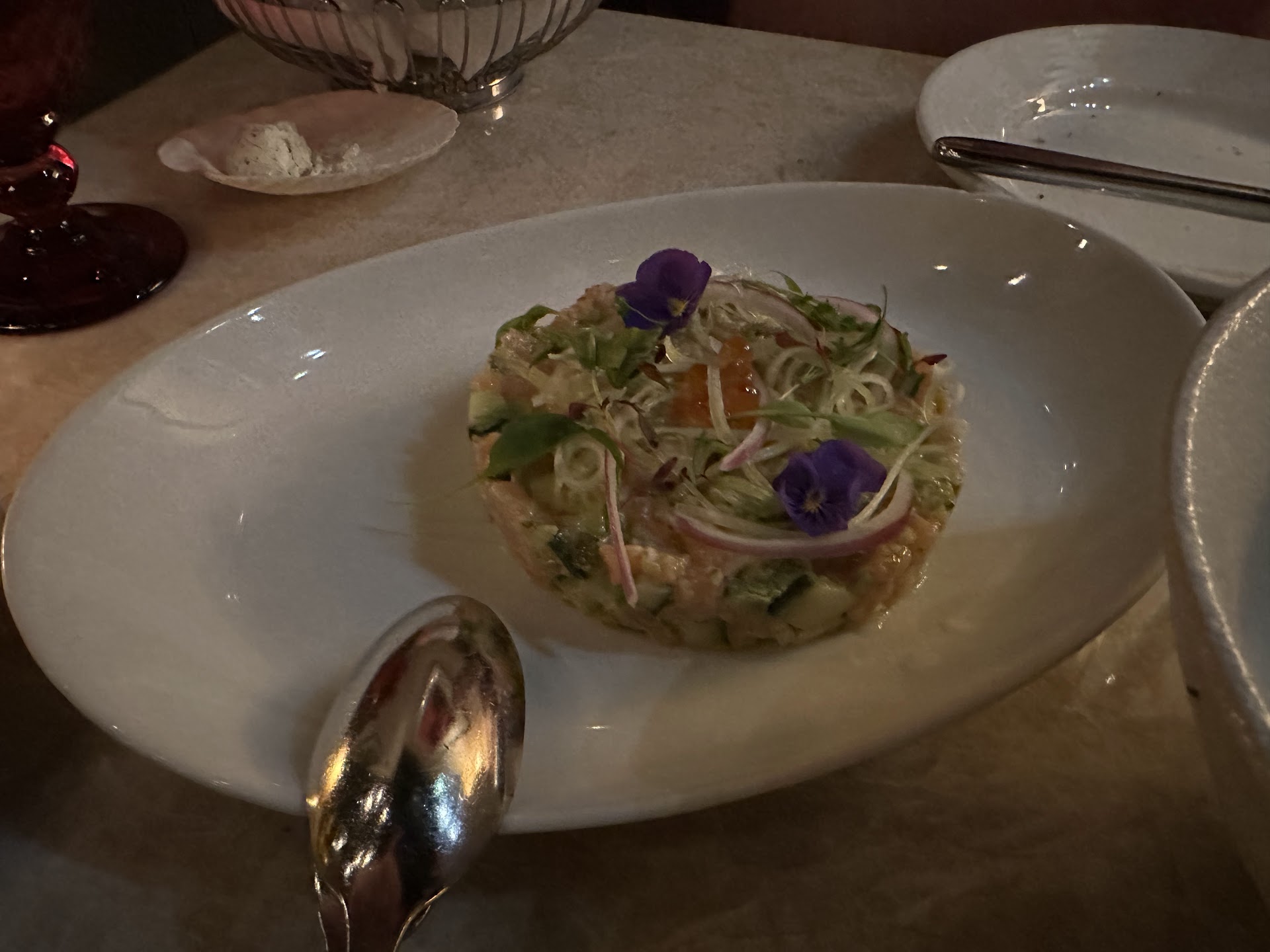 Read moreWe tried to be considerate and downsized our reservation because our friends could not join us. Probably not the best move. We received a table in the middle of the floor but with a view of the bar. The restaurant is overcrowded with tables. There is barely room for patrons or waiters to pass. The tables are set at angles to fit the optimal number possible and when you attempt to sit your chair will undoubtedly come into contact with your neighbors. Toss happened to us more than once. We had an earlier reservation as we were going to the theater and we were told to share this with the waitstaff so they could get us to the theatre on time. I thought this curious as we'd made our reservation with plenty of time to walk the half-block to Lincoln Center. We did do so and it was probably our second misstep.The waitress was attentive and our drinks were served cold and our appetizer was served hot. Our mains were only lukewarm and mine was supposed to be blackened and broiled and it was neither. The dessert was a dissapointment also. It seemed they scraped the bottom of the barrel for a small scoop of swirled, ice encrusted sorbet. The alcoholic coffees were slightly better but the fake cream on time melted quickly and made it flat. The bathrooms on our level were single use unisex and pretty filthy, not a great view while your eating and after have waited to use them. The other bathrooms were better but down a considerable flight of stairs. The four stars are for the convenience to Lincoln Center, the waitstaff and the kitchen who did serve a tasty meal if not quite hot. The dishes are stored on the wall in the dining area so be prepared for a crash or two if you're there long. We experienced a loud one, but without many turned heads or apologies from the bussers so I imagine it's a pretty regular occurrence. Not sure if I'd return. There are many restaurants in the area to try. Maybe...