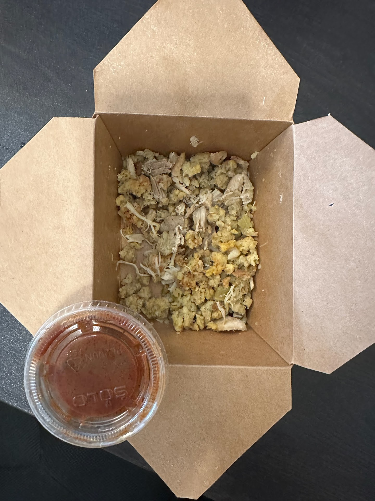 Imagine my disappointment and pure disdain for this joke of a "lunch special" when I got home and saw the two to three ounces of chicken and small container of stuffing I was given.