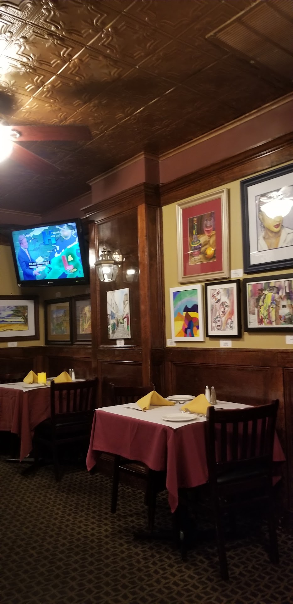 Here's a very cool neighborhood watering hole that is really quite antiquated and fun. Between the entryway which divides The Bar from The Main Dining Salon, it retains the original tin tiled ceiling and wood mouldings everywhere. The walls are overly decorated with local artwork by students. And the table spacing is cozy though crowded. Insofar as the menu, it's definitely an American pub-styled fare. Moderate to expensive. On average, more homespun than anything else. And, difficulty getting past the funny taste with the ice cubes -- which signals something inside the kitchen ... like Gordon Ramsay's Kitchen Nightmares! Otherwise the wait staff is youthful, bright and intelligent. Articulate and ultimately fruendlier than the male patrons over on The Bar sidelines. Food plus beverages did add up, but given this is the only decent restaurant serving this kind of menu ... burgers, steaks, etc., it's great with the locals. For business meetings as well.