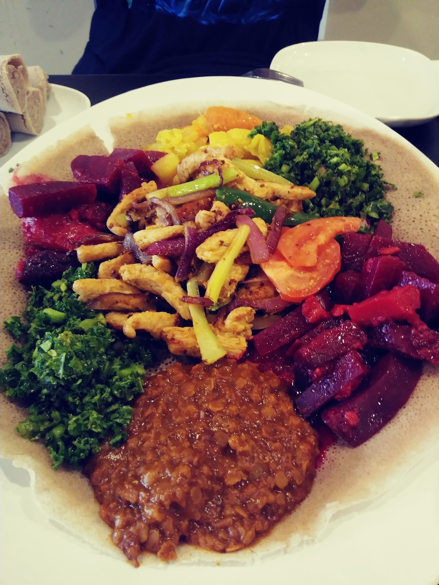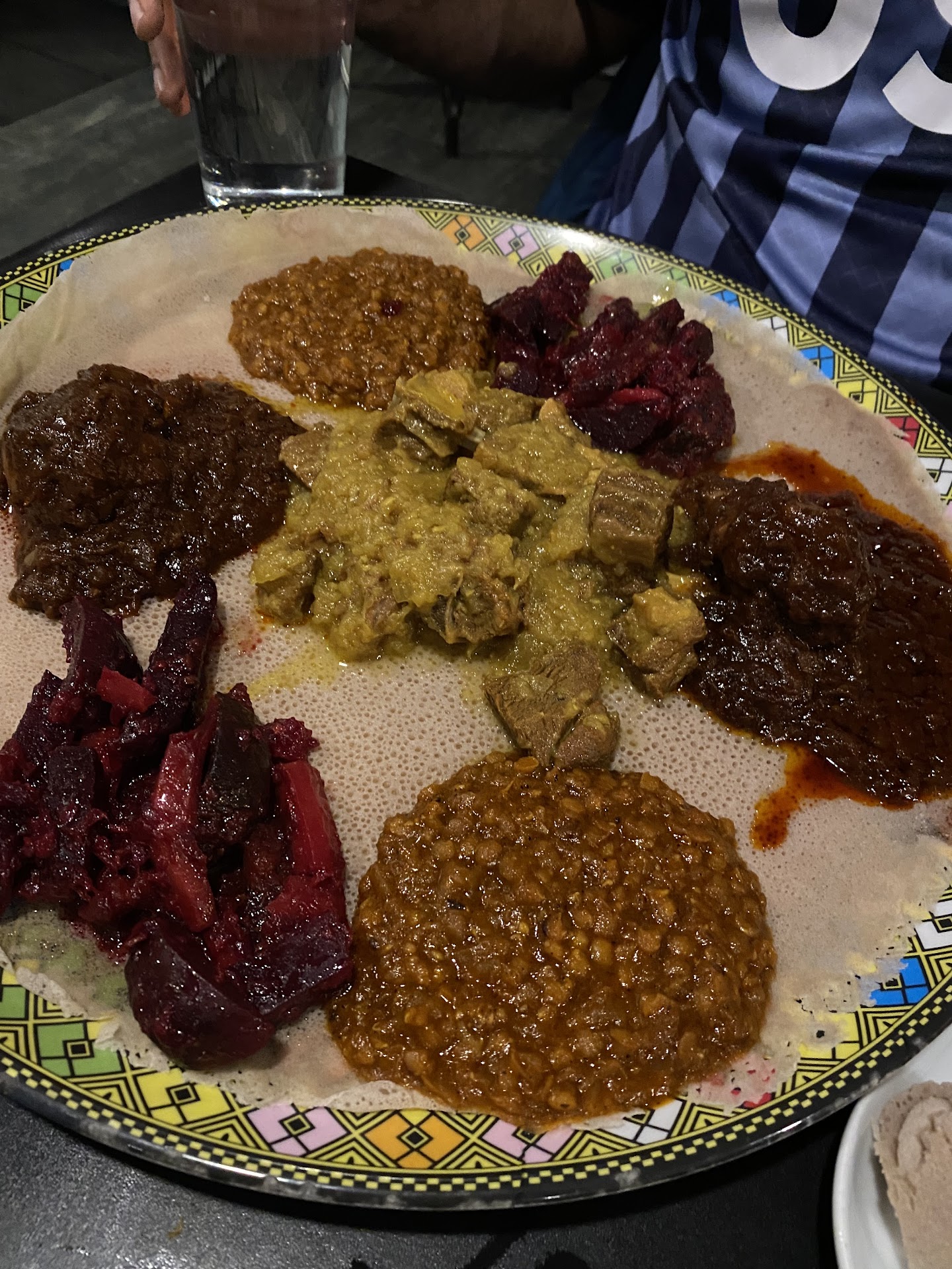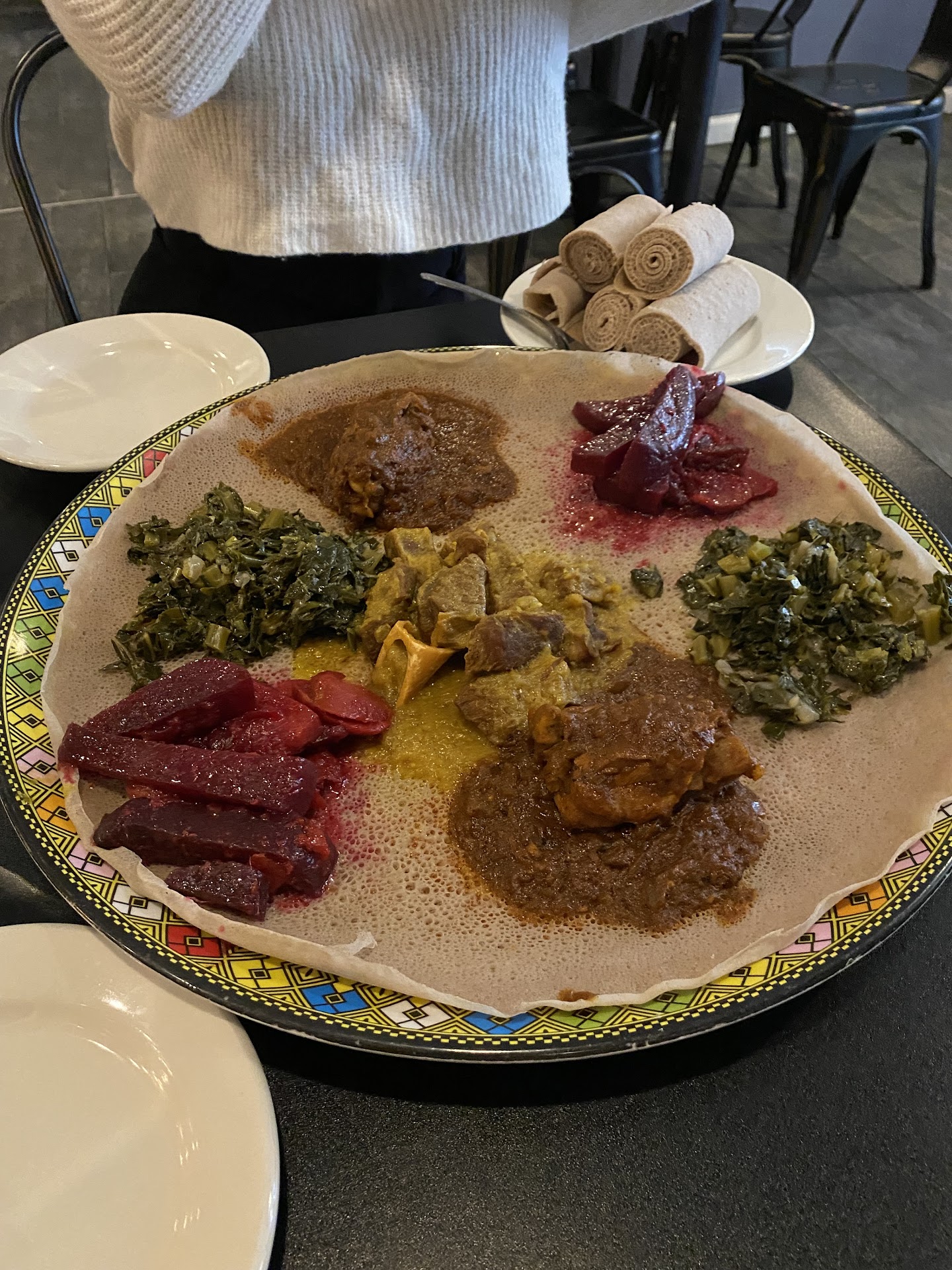 We ordered: Meat Sampler For 2 with Beg Alicha, Doro Wat, Key Sir Alicha, Gomen Beg Alicha(lamb in the middle) More like a curry-style dish. The lamb stew was so well seasoned and the meat was easy to chew. Although it was well-seasoned the flavors were more earthy and weren’t too strong (not spicy)👍🏼 Loved the turmeric and ginger seasoning Doro Wat (red chicken) Favorite sampler out of all 4! The chicken thigh was so juicy and tender, and the flavors were nothing like I tried before. The stew was so rich and thick, yet not heavy. The rich flavors of the Ethiopian bebere spice blend (that contains ground fenugreek, chiles, paprika, ginger, onion powder, cardamom, coriander, nutmeg, garlic, cloves, and cinnamon) really stood out! No wonder it was praised in a food article Key Sir Alicha Beets and carrots with red onion. Definitely a very light dish. The sampler didn’t go that well with the injera because the chunks were so big so it was harder to wrap. The dish was slightly sweet but overall wasn’t that interesting. Gomen The collard greens were well seasoned with ginger and garlic. But overall wasn’t really interesting either, reminded me of home cooked Chinese stir-fried chopped veggies