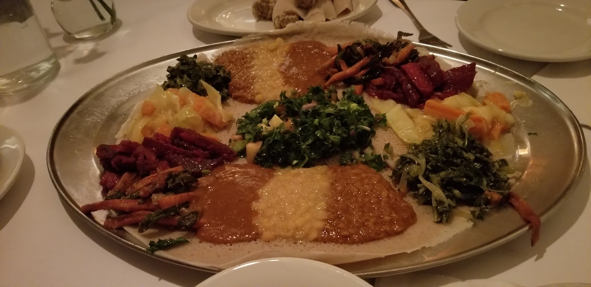 Read moreFood was good - freshly made, well-spiced. The injera rolls were served cold, clearly had been in the fridge. Would have been nicer to have had freshly-made injera. Price was about $20/person for combination plates for five people. Service was okay. What bothered me was that there was a sharing charge, and that if the party ordered less in combination plates than the number of people in the party, there would be a surcharge. Seemed absurd to me for Ethiopian food, which is served and eaten shared, even more so than Chinese food! I was also not pleased when the waitress informed me that she had done me the favor of automatically adding a 20% tip to the entire tab (including the tax), for our party of five, even though I had to seek her out at the register to get a check, after having repeatedly asked for one. But the food...
