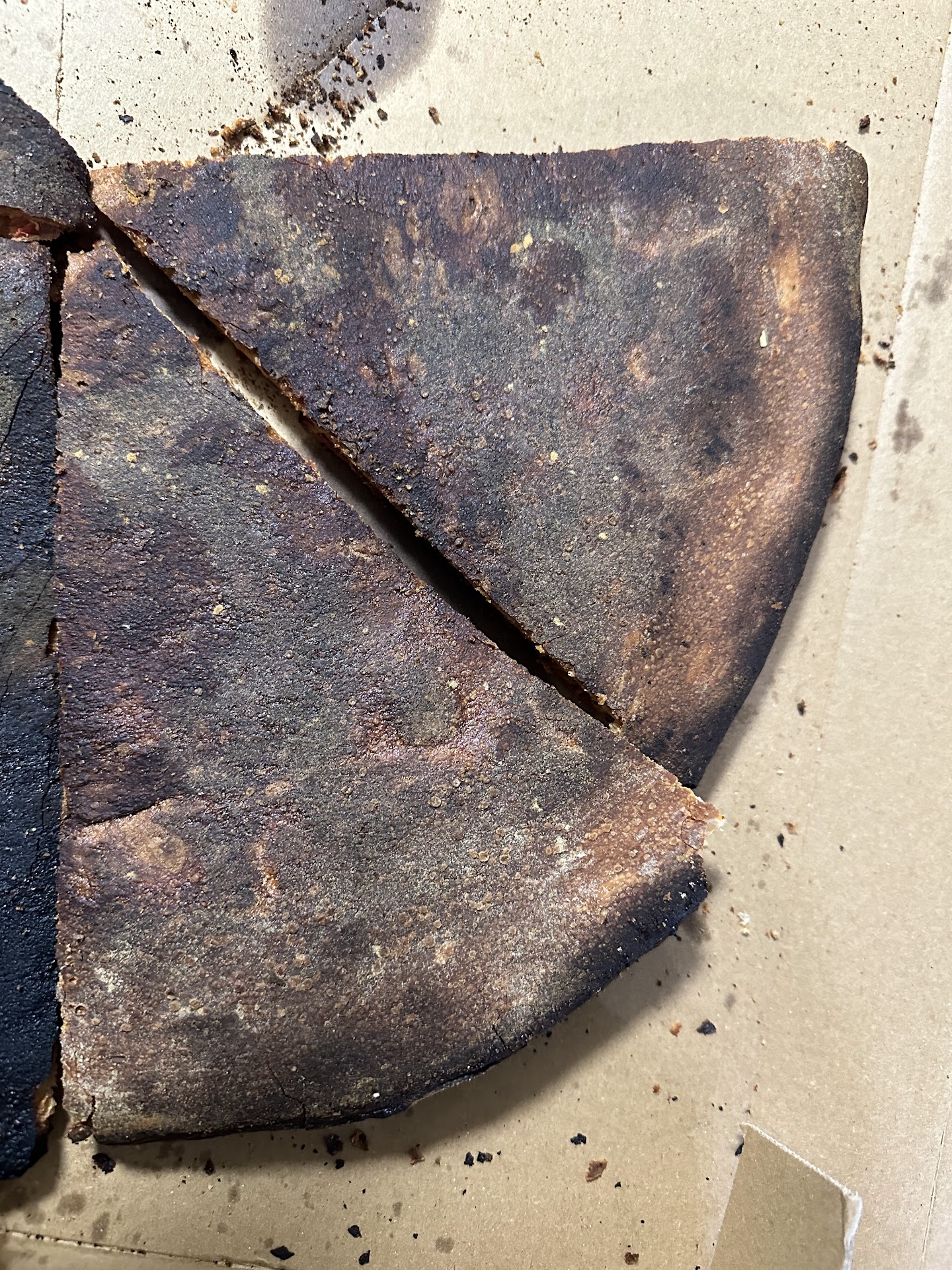 The slices that are still intact have a way too thick and hard crust that feels like Iâm eating cardboard. The pizza tastes overpoweringly yeasty, like the dough is over fermented. There is barely any sauce on them, and not just because the sauce slid off the other half of the pizza. All I taste is yeast.