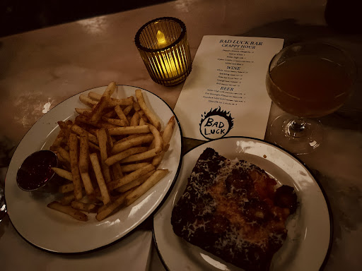 Donât buy the food. Otherwise cool. Always walk past here after the gym and see thatâs itâs packed so we decided to come and have a drink one night. Had a nice time overall and would come back for the drinks and it seems to attract cool people but I would never order food from here again. We got the pizza and fries. The fries were fine but the pizza was little hockey pucks and burnt to a crisp. Idk who would ever think it reasonable to serve pizza with full char on it like that but here we are. I can only imagine what the oysters are like. They should just partner with valentines on the next block and everyone would be happy. Just donât burn it. Anyway I asked them to take it off our check and they did. Pleasant staff. Would def come back for happy hour...