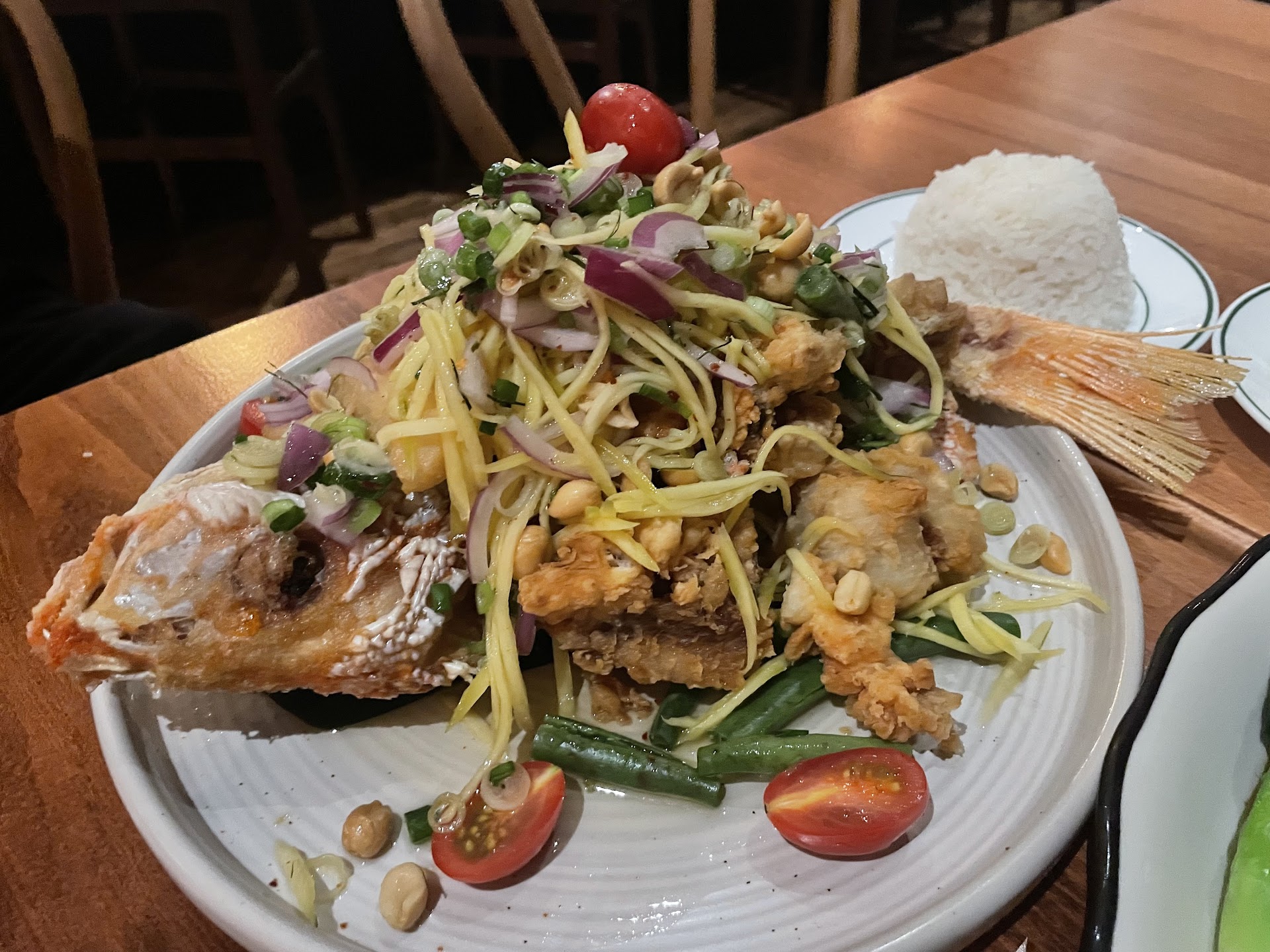 Read moreThis is my first time ever trying Thai food and I really enjoyed it. My friend invited me because this spot opened up recently in the neighborhood. An innovative and interesting take on what they call "New-Thai". They definitely knocked it out of the park. I highly recommend the Pla Tod - a whole red snapper (which is already deboned and filleted) topped off with this yummy Mango Salad and Thai dressing. We also had the shumai, which is their take on a Thai dumpling. And the calamari which was paired with a pink sauce. Writing this makes my mouth water because I am still thinking about that pink sauce!! And can I say - their cocktails!?! It was 90 degrees on a Saturday my girlfriend and I went in around 1pm and they had a weekend early happy hour special !!! The cocktails were so delightful and refreshing. And their dessert....the list goes on and on. Such a great place, will definitely...