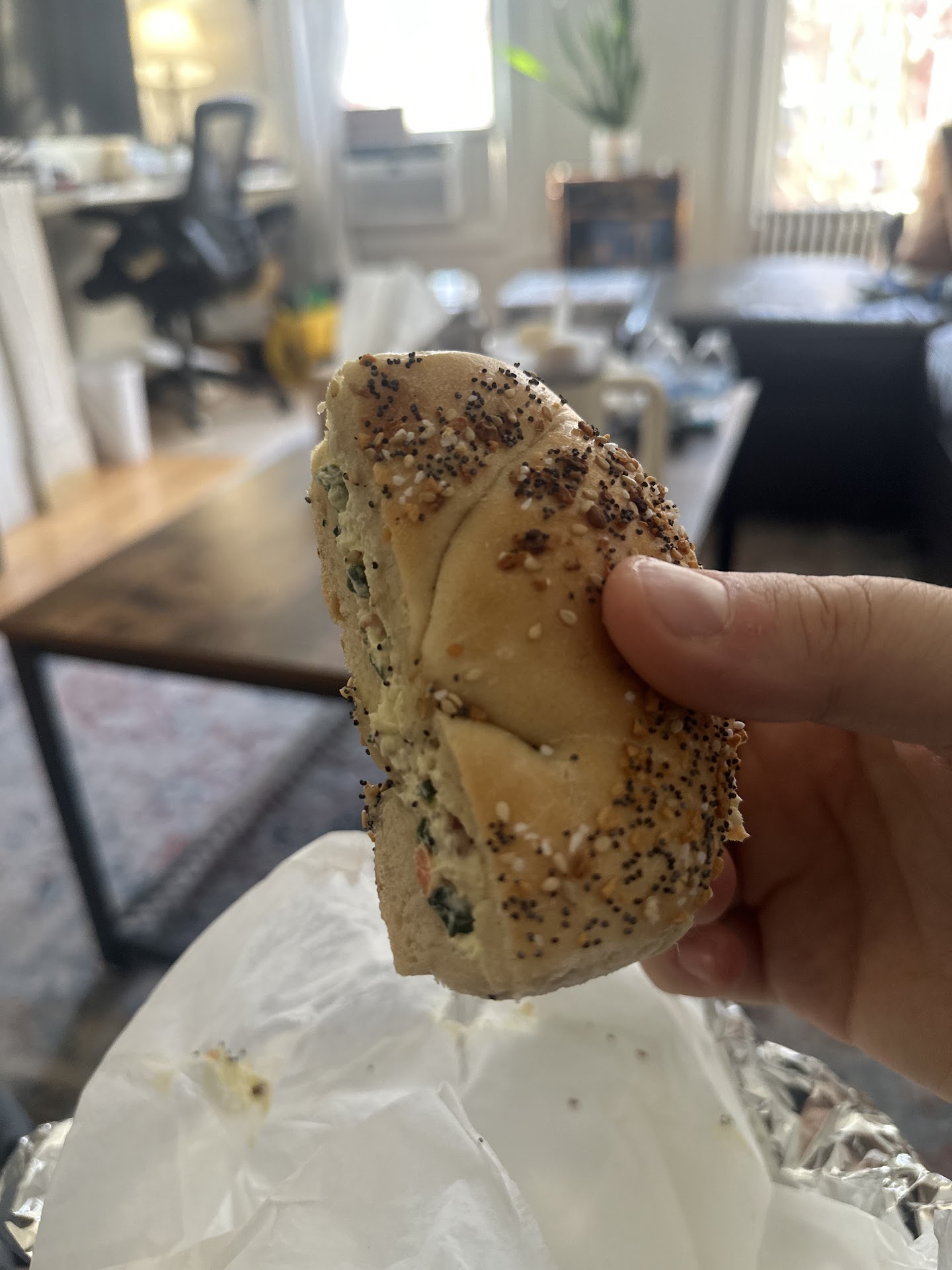 Read moreThe paranoia I'd felt on the train was fading away. The weed clearing from my mind, I could now see that yes, everyone hears all your thoughts, but that, more importantly, nobody cares what you have to think. I analyzed this delicate fragment of recently precipitated knowledge as one does a piece of sour candy on the tongue: shifting it back and forth uncomfortably, but not without an undeniable tinge of perverse pleasure. Walking up to the counter, I considered ordering a salt bagel with plain cream cheese. "Whole wheat wth jalapeño cream cheese! Toasted!" I practically shouted. Did I make the correct decision? I don't know, why don't you ask...