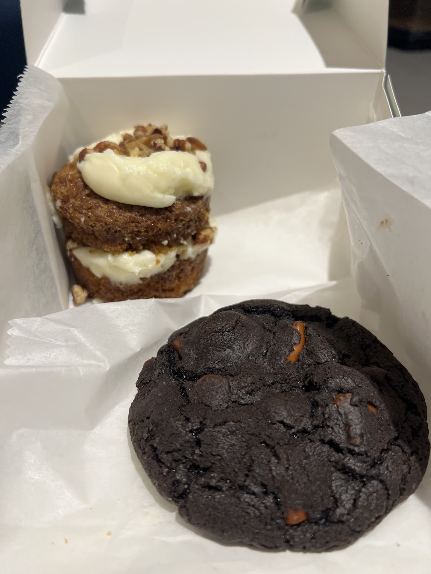 The pecan tart was packed with pecans and caramel and is simply amazing. The PB marshmallow cookie had a great combination of crunch and softness due to the marshmallow. It's Chocolatey and packed with flavor. BEST carrot cake I've ever had. Won't do justice trying to describe it. Just try it. Classic and satisfying chocolate cookie. Nice to have a bakery in the neighborhood founded by someone who is passionate...