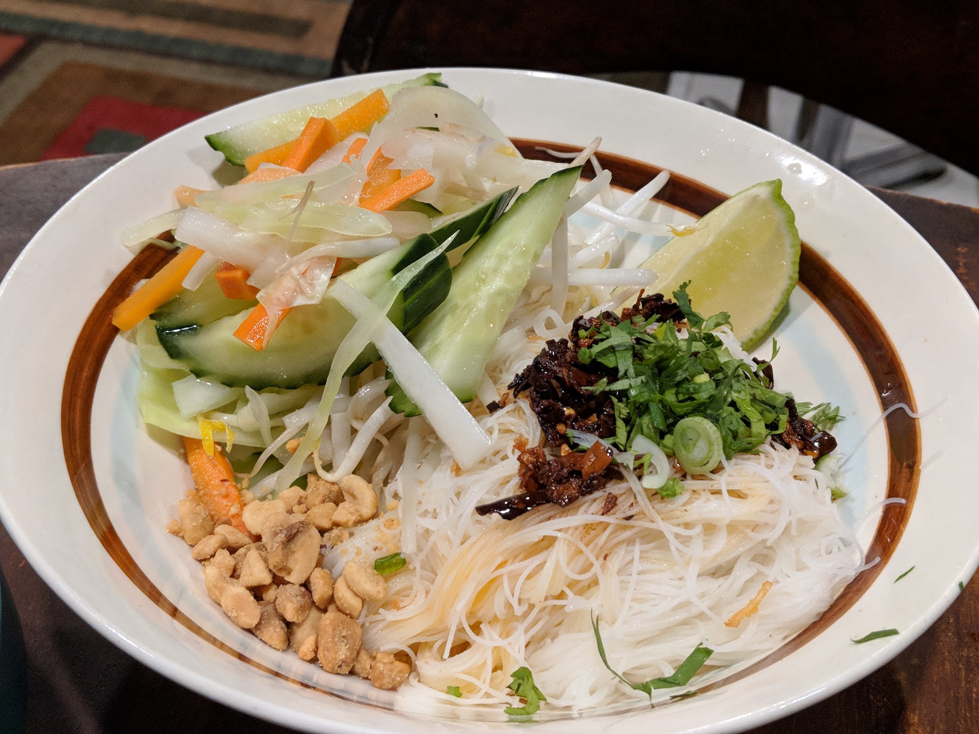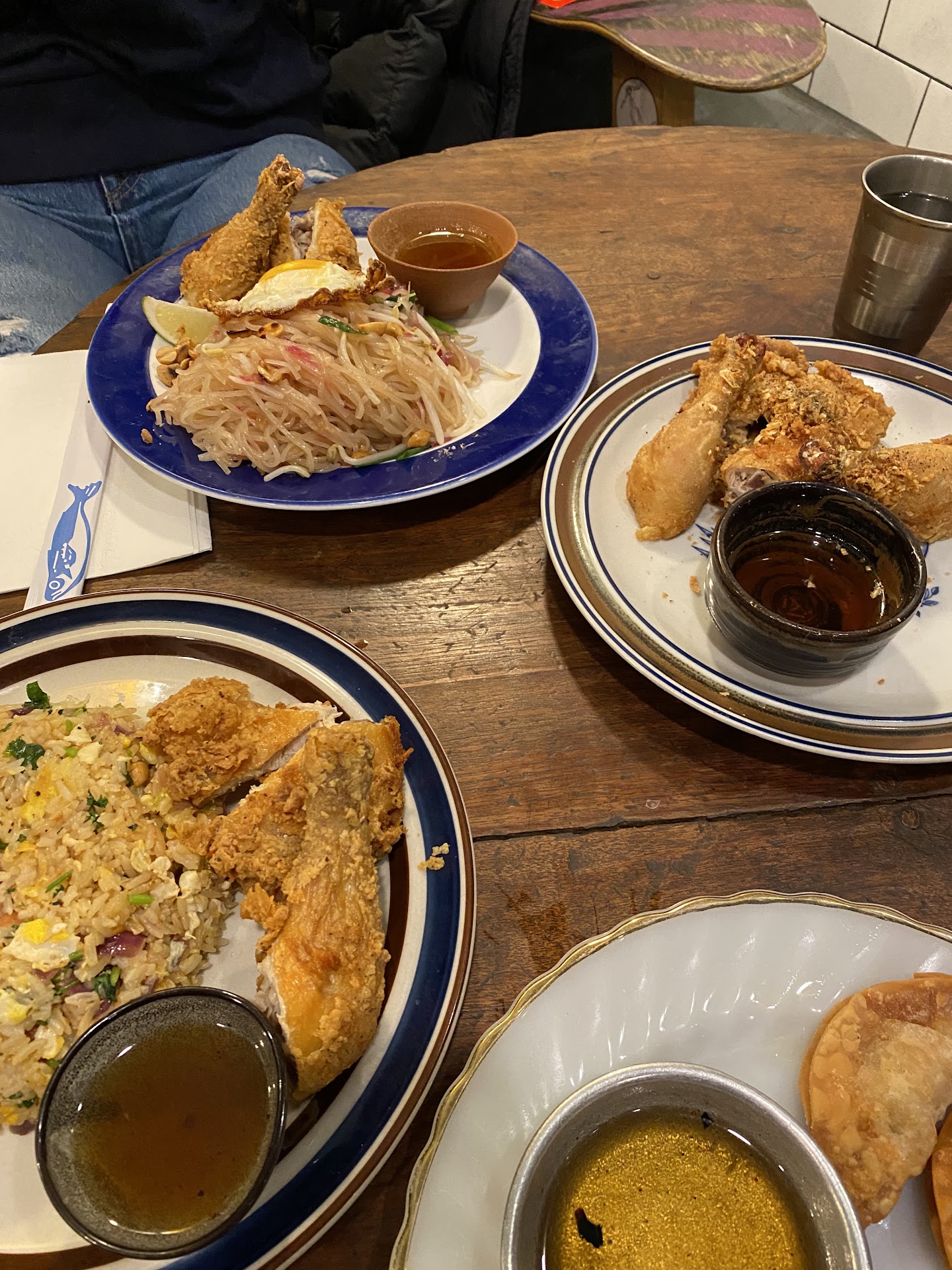 The meals were served in mismatched dishes adding to the ambiance. The cabbage salad was good and definitely worth a try on the side to share The Larb fish was so flavorful and yummy The pad Thai was sweet and delicious, the fried chicken was incredible. Let me repeat THE FRIED CHICKEN! The Tamarind Coconut Milk Noodles is very unique to this restaurant. Never seen it anywhere before and it was definitely interesting to try. It was a little sweet and pink.