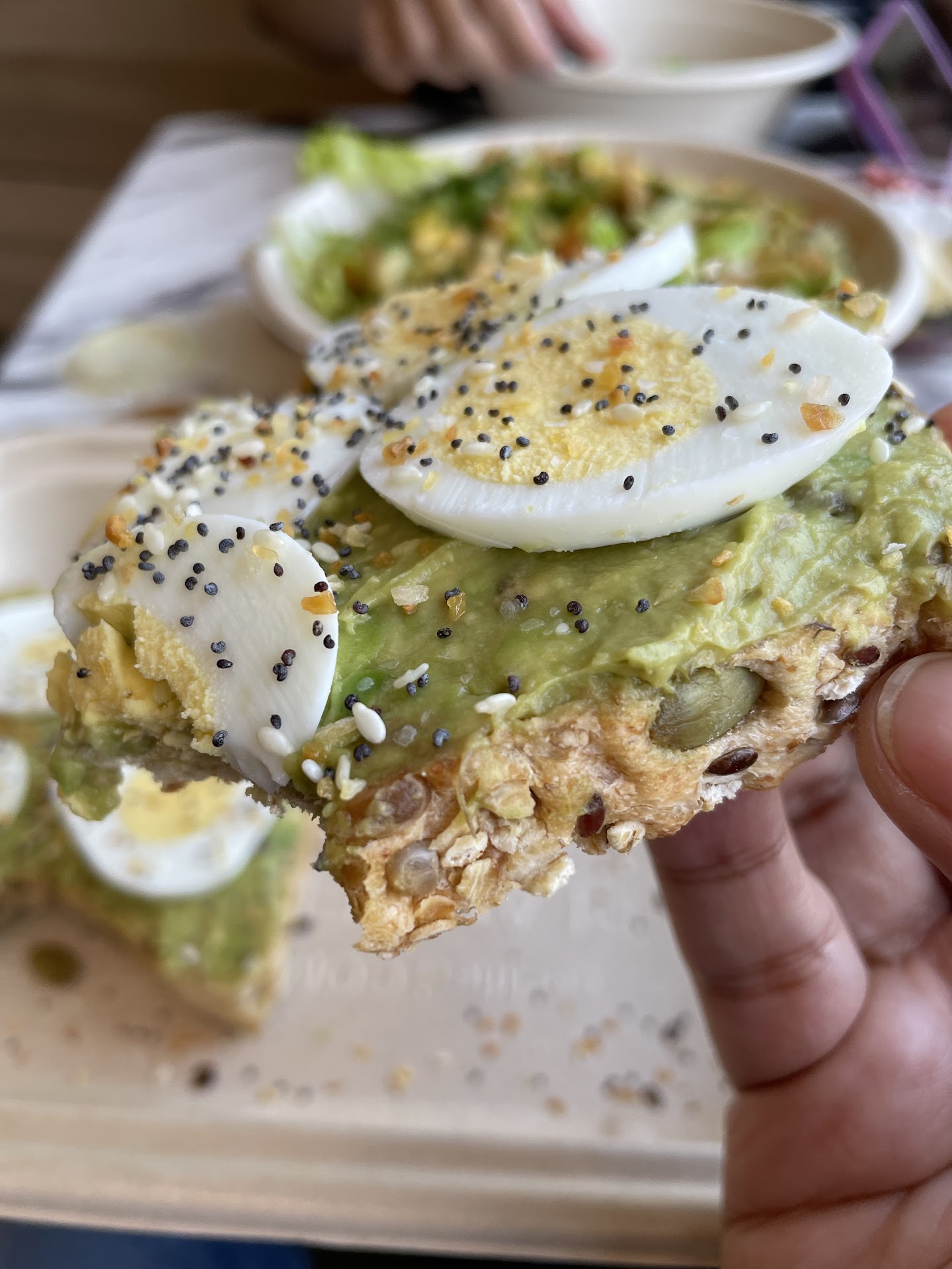 Protein Toast on multigrain bread, mashed avocadoes, slices of hard-boiled egg and everything seasoning. This was my favorite dish from what we ordered. I thought the multigrain toast was delicious and went very well with the Everything seasoning that was sprinkled on top.