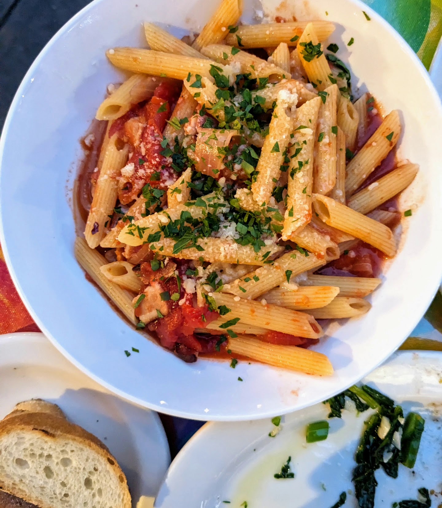 First, Bar B reminds me of the intimate little chef-run spots you find while wandering through narrow backstreets of Barcelona, Lisbon, or Tokyo. Second, the staff is fantastic: warm, attentive, and fun. The vibes are impeccable. Third, the food and drink are terrific and fairly priced. We had aperitivo spritzes to drink and sampled everything from the yummy potato salad to the juicy chicken skewers to an awesome daily special of shrimp and mushrooms in a lick-your-fingers-good garlic sauce. We topped it off with a seasonally perfect chestnut crème brûlée.