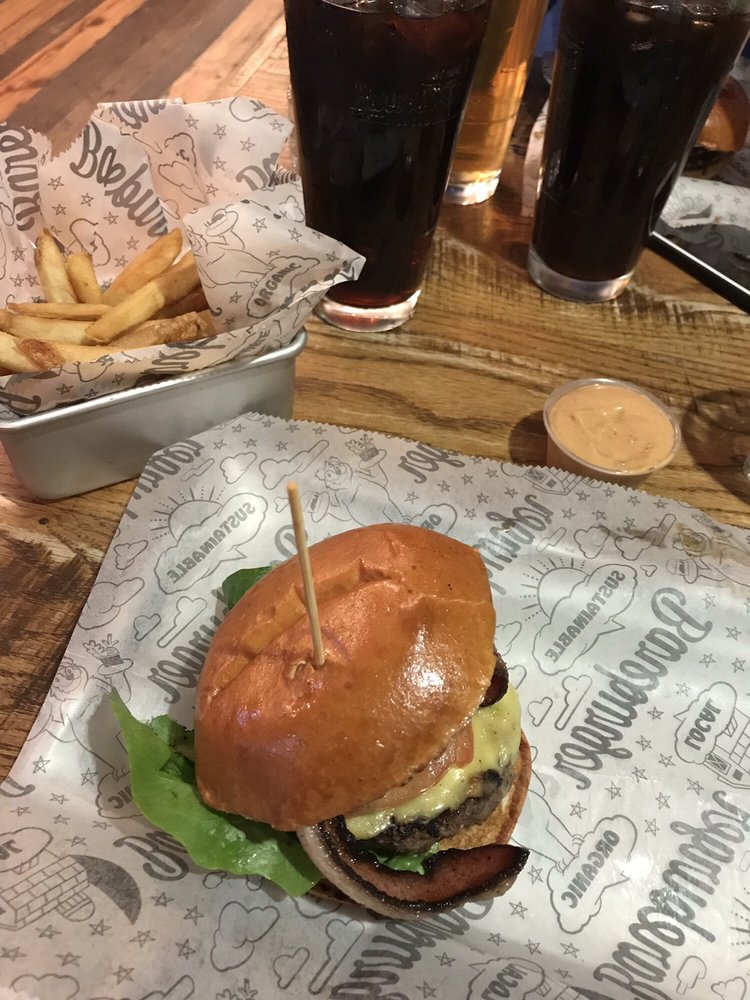 Food: Average would be a fair description for the burgers we ate. I ordered the American burger and the meat AND THE BACON were very undercooked (which personally, I HATE) and the meat taste was very bland and meh. The bacon was crazy though you expect a nice crispy and crunchy and tasty bacon then you get a fatty undercooked piece of pig, I could almost hear it "oink" because of how raw it was.