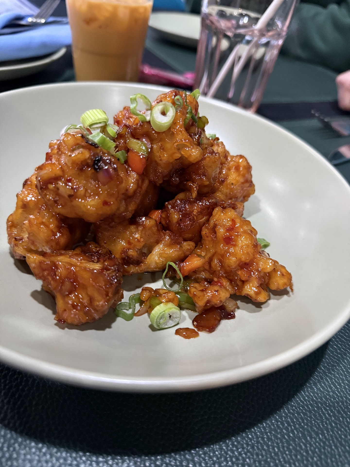 the thai basil fried rice with tofu was nicely spiced with actual thai basil, not oily, and even if i was weirded out by the bell peppers, i liked how they fried the tofu (protein of choice). the chicken satay was juicy, big, served with lime and a really good peanut satay! i wish there was more satay it was that good. honey chili cauliflower was awesome- crispy and sweet. the tikka salmon was perfectly cooked. the people i was with enjoyed their indian curries (chicken tikka masala, vegan tikka masala, lamb butter masala).