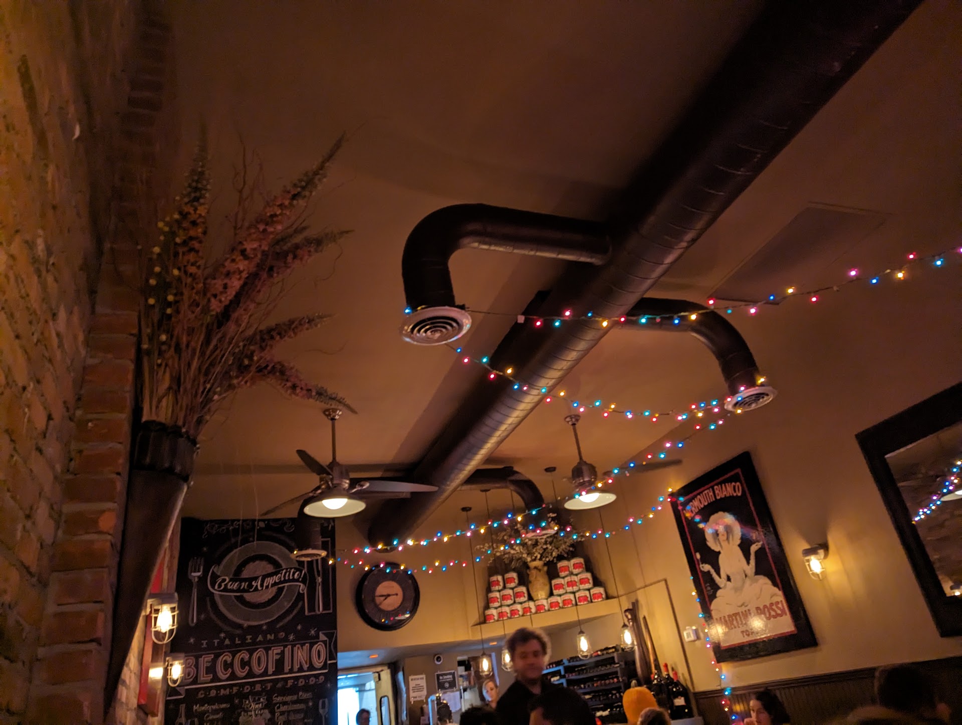 Checkered tablecloths and bare brick walls simply decorated with a large mirror create a bistro ambience, but the twinkle Christmas lighting strung from the ceiling was just annoying. Management should replace with brighter string lights so patrons don't have to use their cell phone flashlights to...