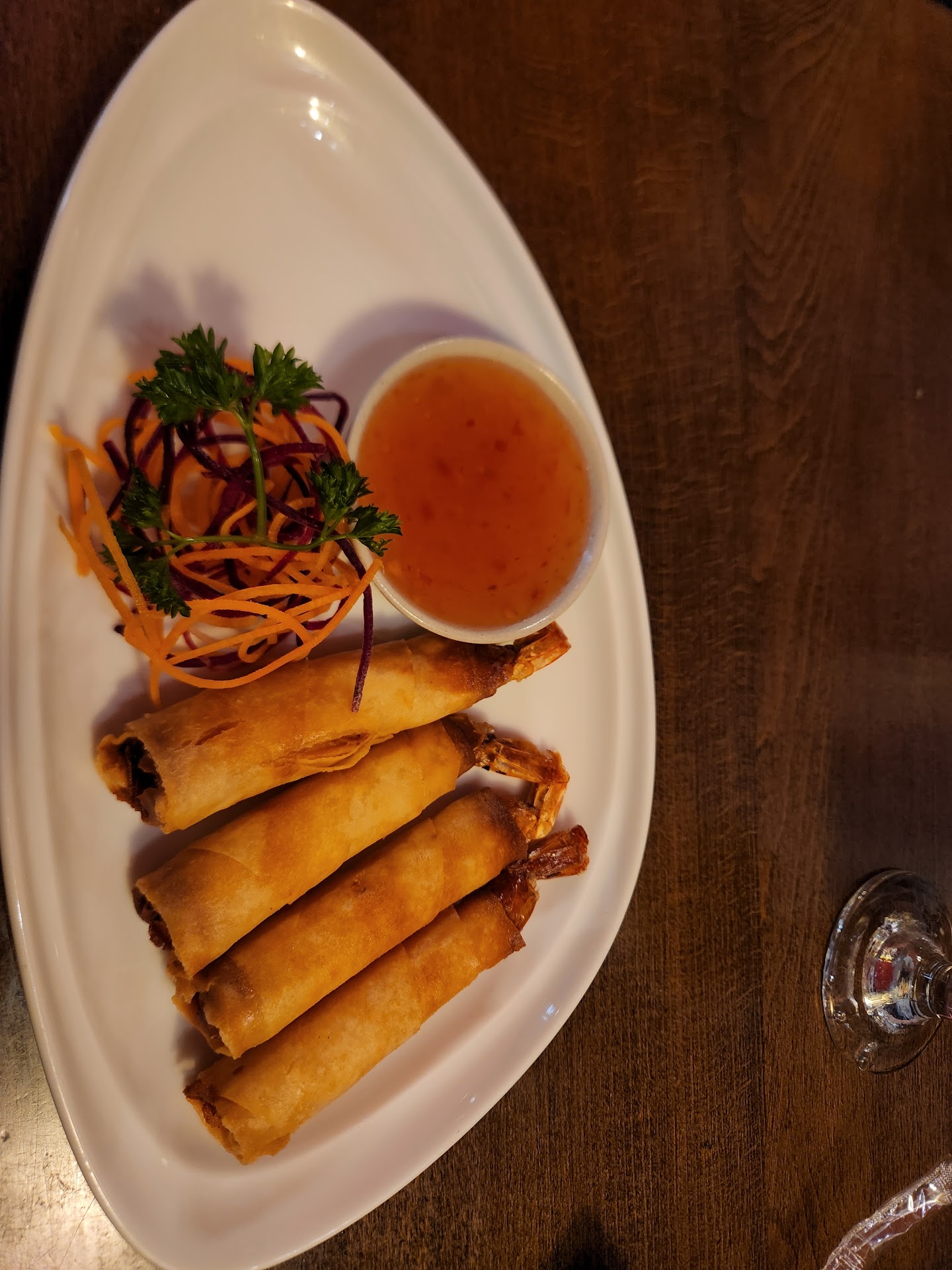 This place transports you on a beautiful journey from the moment you step into the door. I am surrounded by beautiful golden statues and wall art. The golden throne as you step into the resturant sets the tone. Drink: Thai tea. The way Pat served with the ambre affect. Once the straw is in the glass magic happens. Very beautiful drink, but the tastes far exceeds the visual appeal. This is hands done the best Thai tea I ever had. It has a chocolate taste to to. The shrimp spring rolls and dipping sauce amazing. The lunch special: Thai style fried rice and clear soup. My time trying clear soup super yummy and warm on a rainy day like today A must have both were very flavorful.