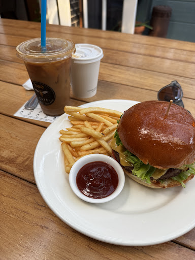 Bee cafe lovely little spot along side a laundry mat. Nice decor. Patio is cozy, with wooden wrap around seating. Good for groups of 5 to 10 people