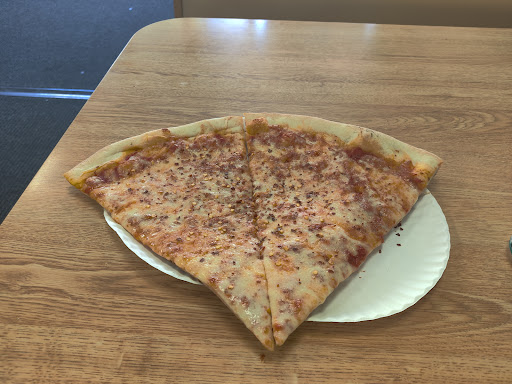 the slice itself is a nice, large slice but its not as thin as the thin ny crust. the sauce and cheese are really good and i can feel satisfied on 2 slices with a bit of crushed red pepper and garlic powder.