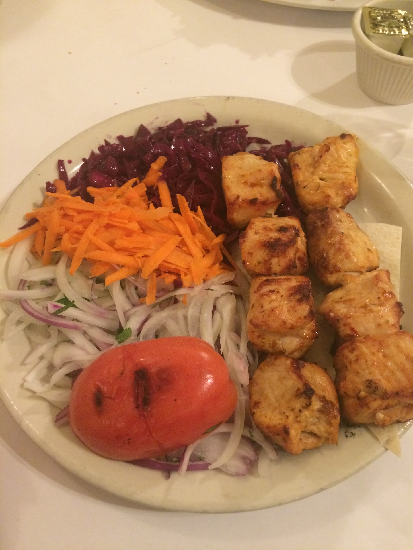 Homies ordered the chicken Adana kebab. Basically chicken mixed with red peppers and spices stuffed onto kebabs. The review? Superb.