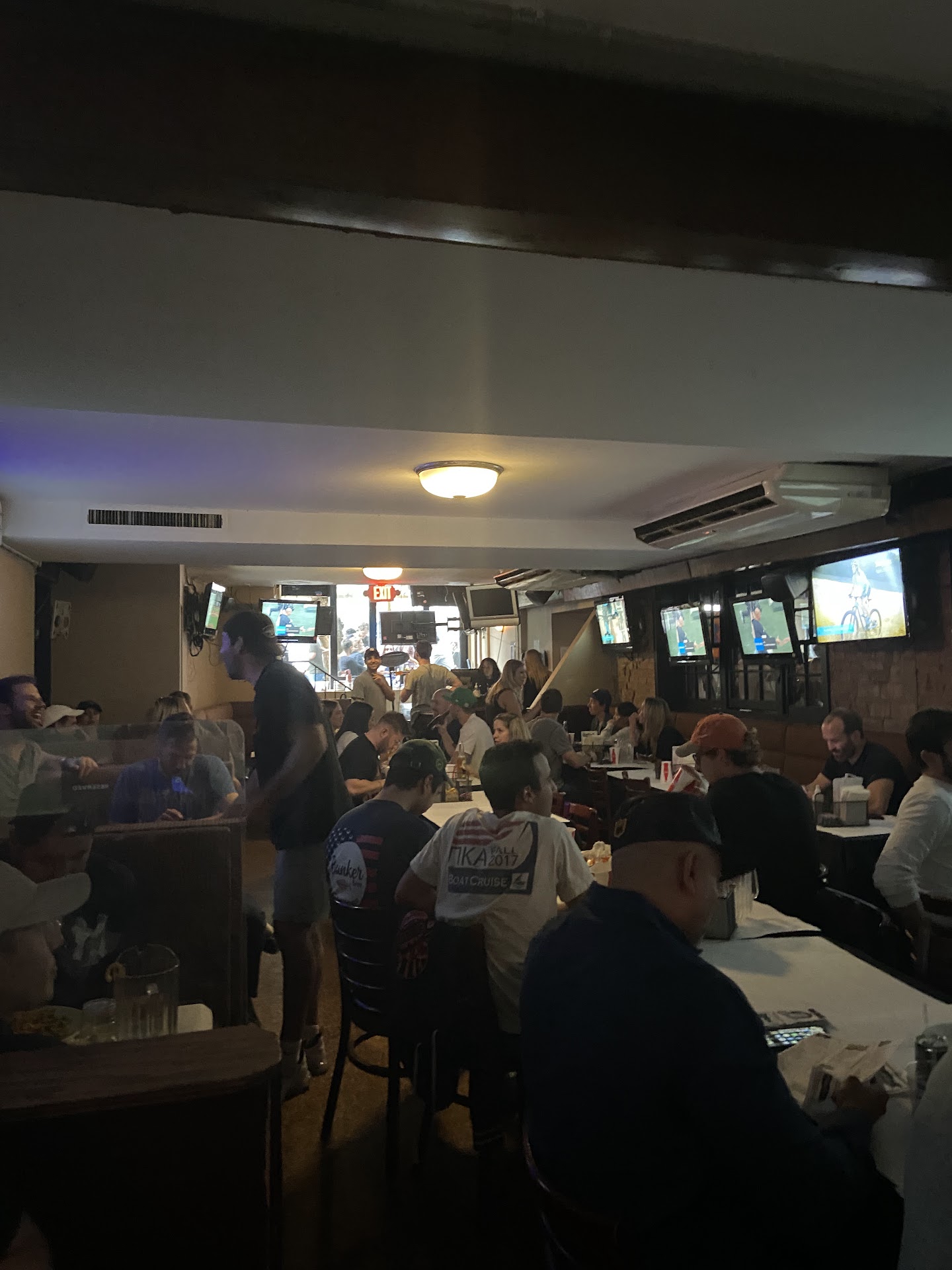 My go-to sports bar! I've been coming here for longer than I'd care to admit ;-) I have a standard order - wings in the first half, chicken cheesesteak in the second half. The wings are all that! They're meaty, good buffalo taste. Your call on how spicy. I have friends that come here when they're not interested in a game, but just have a wing craving. I control myself by limiting it to only when I'm there for a game - that's some control right? In general, it's enjoyable bar food. Just stick to that. Bartenders are friendly and will remember you. Again, don't go complicated - they're not mixologist - I don't recall not getting beer. If you know you're going, you can make a reservation for your game. If it's a football weekend do that early. There's sometimes a problem getting in for your late game when the early games run long - I get it - they have to let the early game folks finish their game and then close out their tabs - but it creates a bit of stress and annoyance. The bouncers aren't good with...