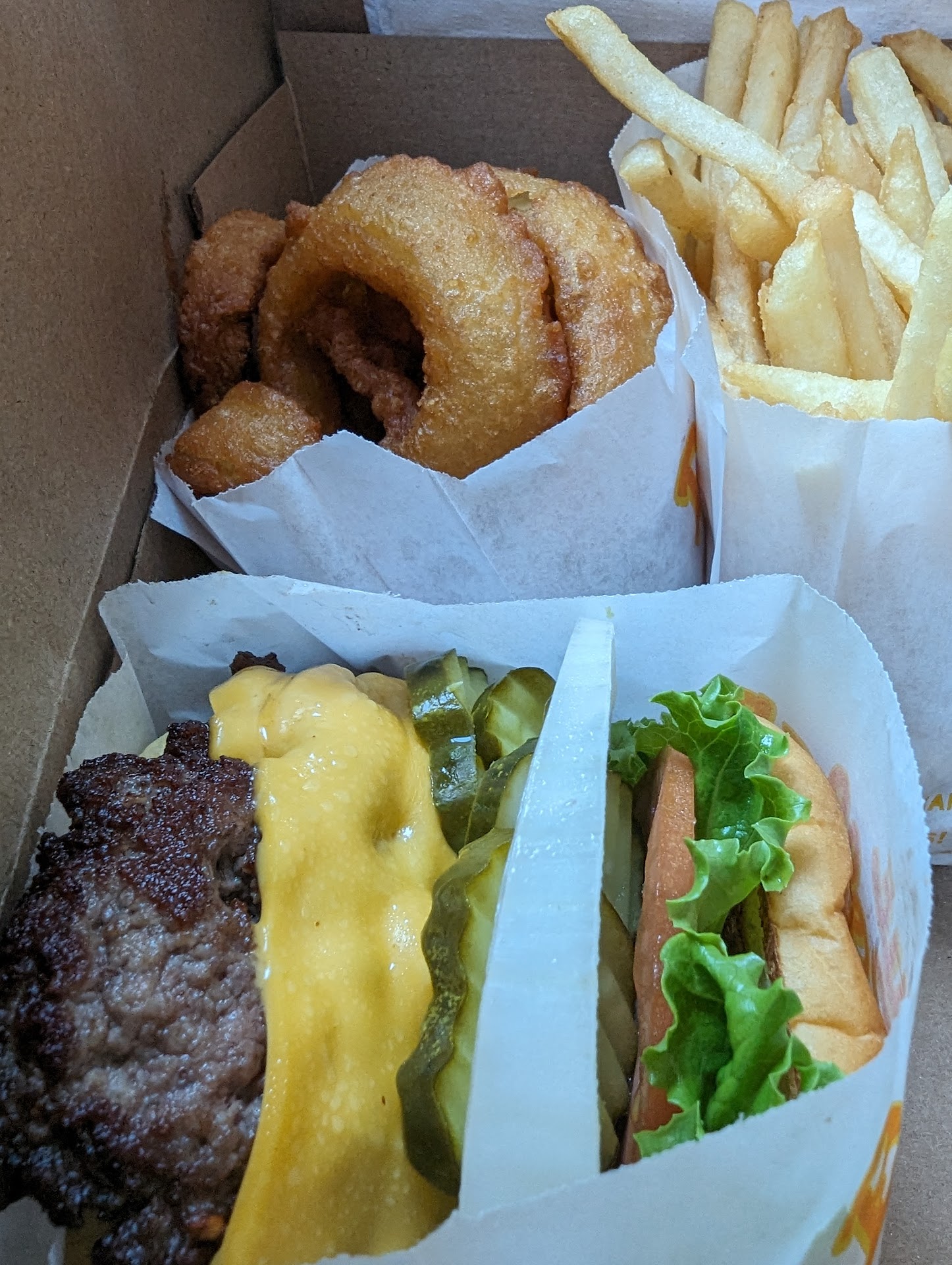 Ordered double cheeseburger, chicken tenders and combo tots and fries. Gave it 5 stars because I like this kind of place: California style burgers, with a tip of the cap to in-n-out, almost there. I admit that it’s a specific style they are going after and you might not ultimately like the style: thin griddled burger patty with a good crisp exterior, American cheese, burger sauce, big fresh onion, tomatoes and lettuce (surprisingly fresh and tasty, but be careful if you’re not an onion fan as it’s a big slice), griddled potato roll. I was definitely happy to order double burger as the patties are characteristically very thin (again, you might not like the style). The burger came wrapped in paper as typical and did have some construction issues as it listed to port making it hard to hold. Combo tots and fries were ok, not spectacular. Probably would skip them next time. But, the sleeper award winner was chicken tenders: white meat chicken perfectly fried, crispy bit not greasy. Side of burger sauce was tasty and a nice companion. All in all, I’ll return again if my cardiologist allows me to. I didn’t order a shake but reports from friends suggest that is a...