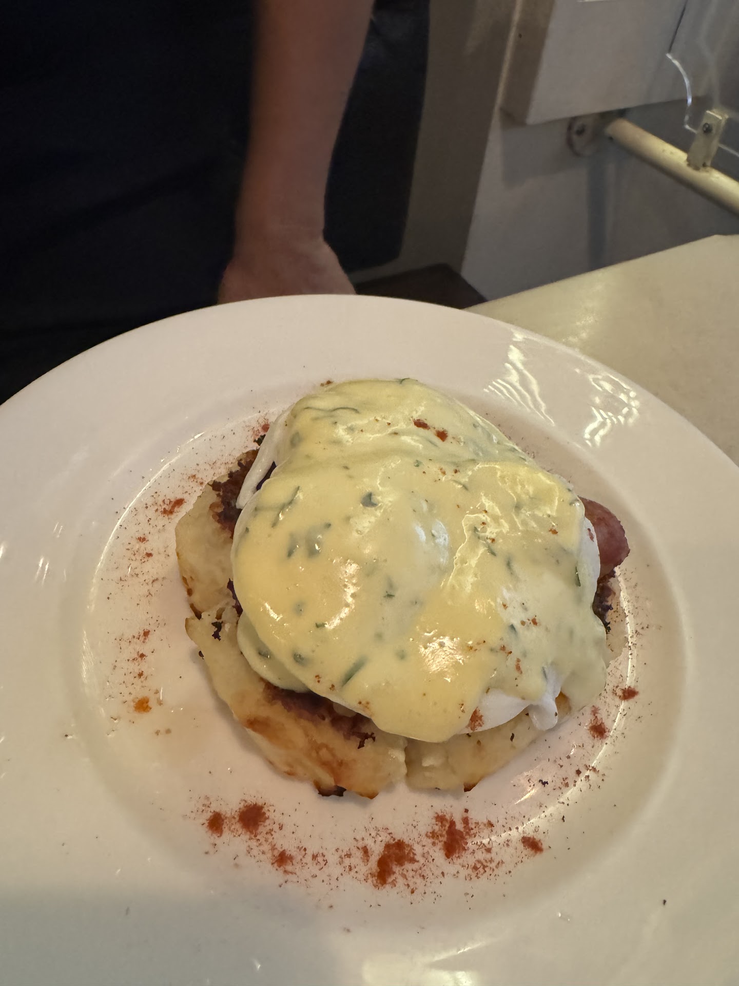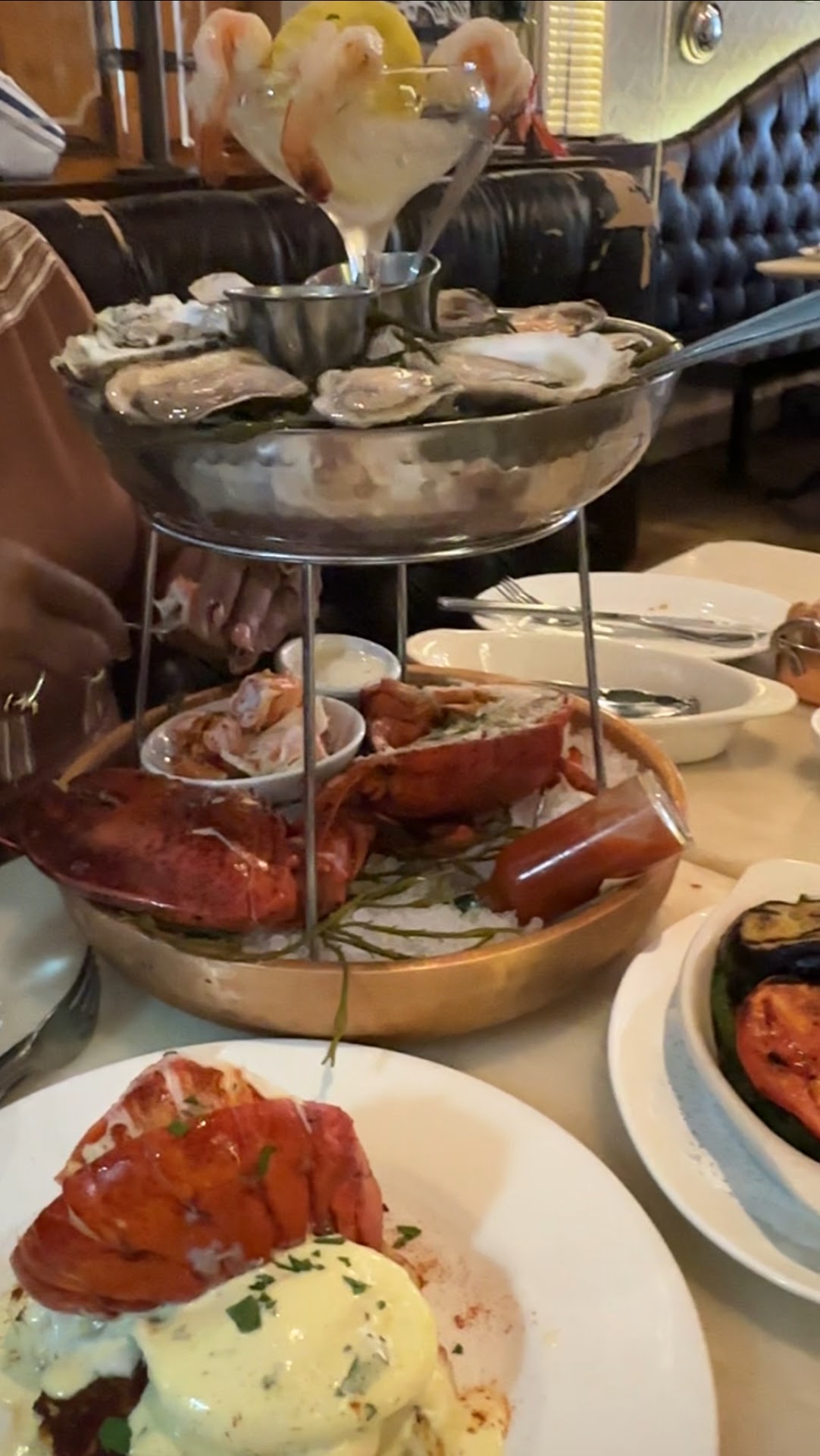 The clientele seemed like regulars, fostering a friendly and welcoming atmosphere. Fresh clams and oysters on ice greet you at the entrance, assuring the freshness of the seafood. The seafood tower was the highlight, with an array of dipping options including vinegar, cocktail sauce, Tabasco, lemon, and an unforgettable lemon aioli. This aioli paired perfectly with the chilled seafood and the potatoes that came with my lobster Benedict. The eggs were cooked to perfection—perfectly runny inside but fully cooked whites, a rare feat for many restaurants.