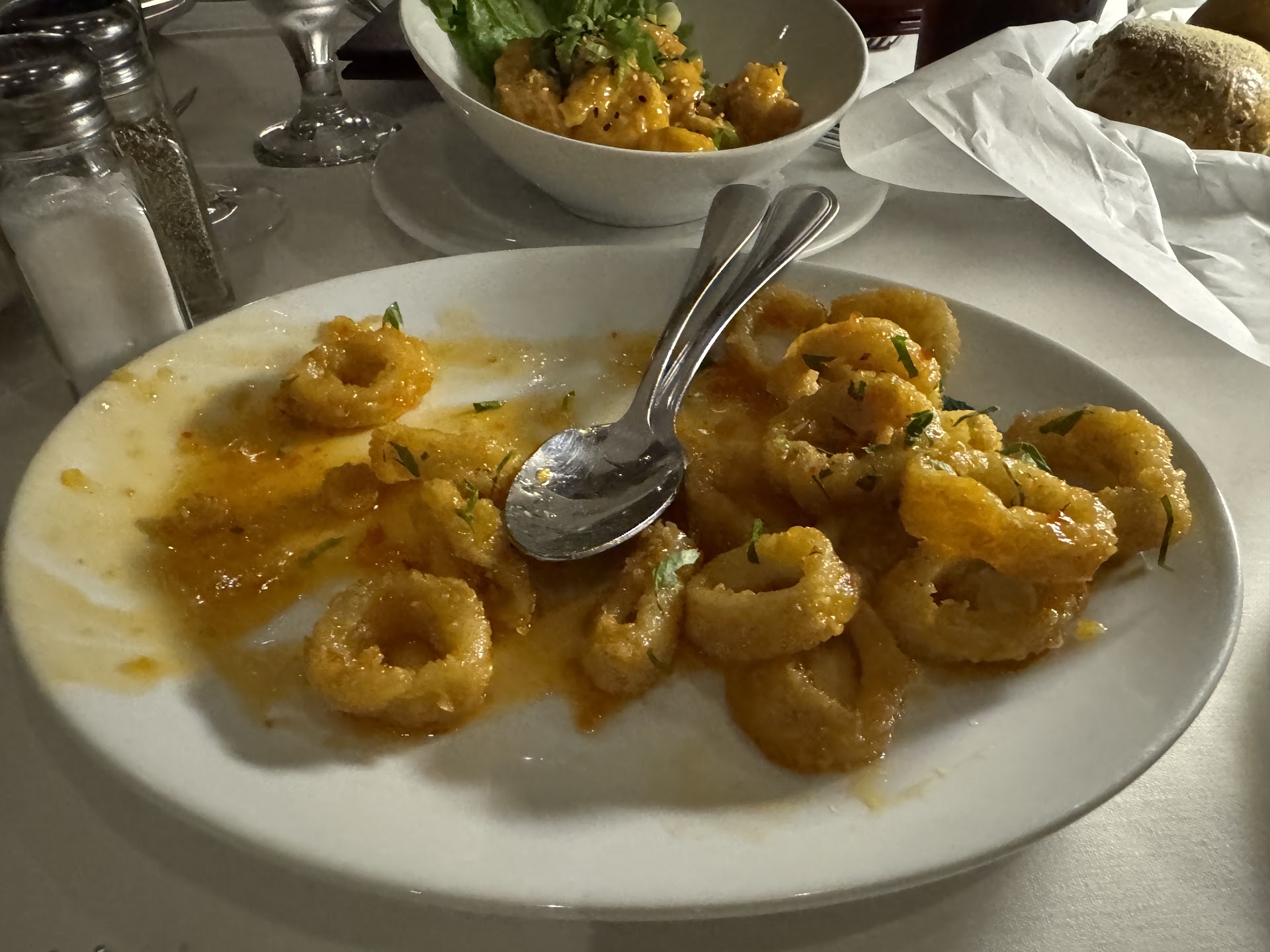 Upon being seated, I gulped down my iced water and after the fact noticed there was a huge, unidentifiable bug in my iced water - I suggested to the waiter that he provide me with an alcoholic beverage to kill whatever germs/bacteria I just ingested. We got past that and sat through the rest of our meal with sweat literally pouring down our bodies. My husband had to leave the table to go into the bathroom, take off his shirt and DRY IT under the hand dryer!!! Our waiter was pleasant and kept telling us that the a/c would be fixed any moment which is why we stayed however, I sat through the meal with sweat literally dripping off my forehead, down my chest and left the restaurant completely soaked from head to toe. No, we did NOT stay for dessert!!!