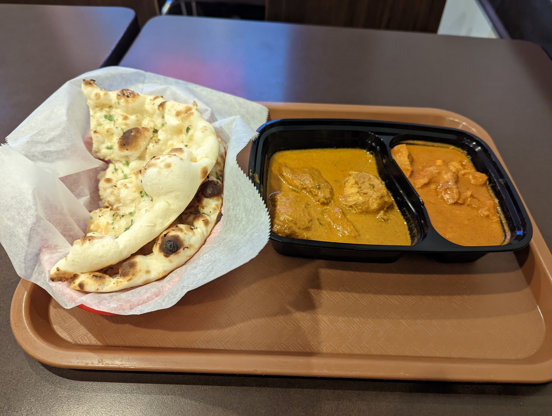 I loved the chicken tikka masala. It was honestly one of the better versions I've had, with a sauce that was just the right balance of milkiness and tomato. In both chicken dishes, the meat was juicy, tender and flavorful. I wasn't as crazy about the curry sauce - it was a little too bland, which is rare for me to say when it comes to Indian food. So in the future, I'd probably just steer clear and zero in again on the tikka masala. For my naan side, they let me have the garlic one, which was very scrumptious. Not the best I've had, but solid overall - not as airy and crispy as I usually like it, but it was devoured promptly nonetheless.