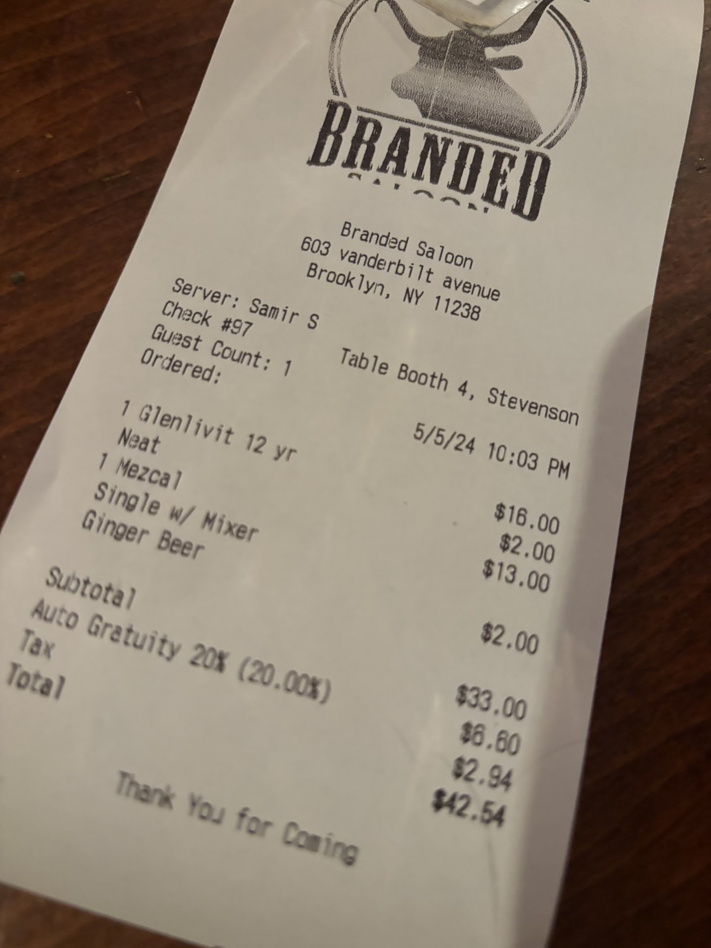 Read moreWent here after a show at the Barclay's. Sat up front, but there was a leaky AC vent, so we went to the back. Server took about 10 minutes to check in. Food and drinks came out in pretty good time, but the table was really dirty. When we asked for it to be cleaned, server took the napkins she brought with our food to wipe the dirt in circles and basically just spread it out (no wet rag or anything to actually clean it). The food was not so good - typical bland 2am drunk bar food, except we weren't drunk. The bar was extremely limited and they charged top dollar for bottom shelf liquor. We asked for water and they brought it in a used rose bottle. It tasted like shower water that had sat for 3 days in a cooler. Waiter never came back to check on us or to give bill or to know I needed utensils. Went to register to pay bill and I wasn't handed a receipt. I paid cash then doubled back to ask for receipt to understand how two drinks and $15 entrees was so much. Turns out there was an automatic 20% gratuity, which on top of the tip I gave, made the full tip 50% of my bill! I was appalled that they didn't even mention there was an automatic tip when I told them the change was a tip. They were legit going to keep my money. I thought that was very dirty to do!! I wont ever go...