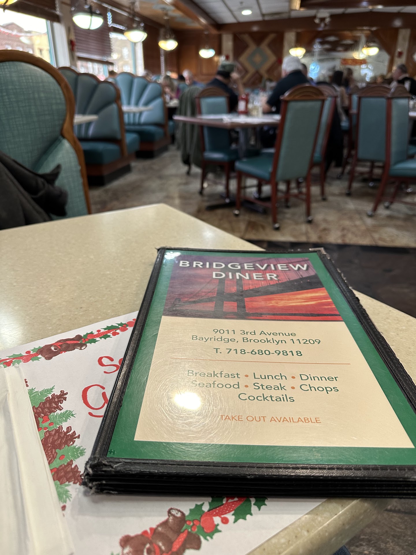 The restaurant is big, has plenty of parking spaces in the back, which is a commodity in Bay Ridge, was clean, the staff was polite and well dressed. One thing you can count on is a menu that is like a novel. You can also count on large portions. Prices are fair for most items.