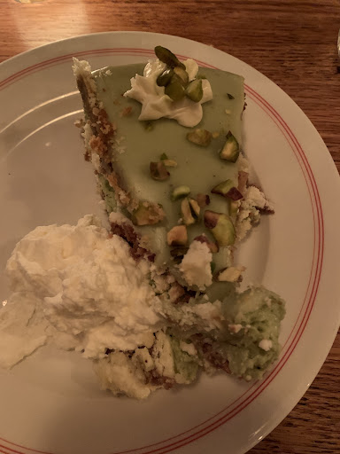We ordered dessert but i wish we hadn’t… what a sad end to the meal. I got the pistachio cake but this is one of the worst desserts i have ever had. It tasted artificial, like hairspray, and the texture of the mousse filling suggested that it contains gelatine, which felt very cheap and unpleasant. My friend had the chocolate cake, which was nice at first bite but had a dusty after taste, as if old ground almonds had been used and the oils had started to go rancid. Overall this was an extremely disappointing meal for somewhere so...
