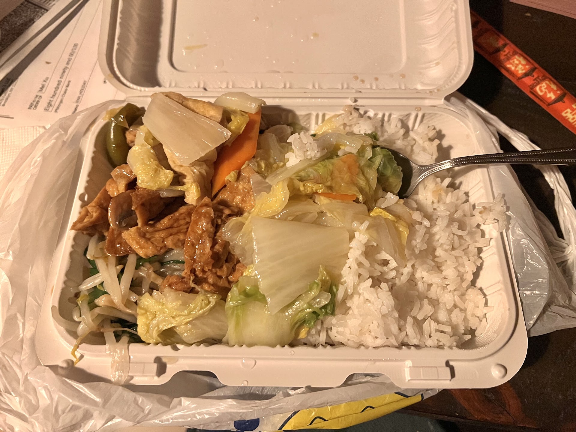You can pick white rice, fried rice, or lo mein, with no extra charge. The fried rice and lo mein are both really good, not the cold/soggy/oily/salty ones you expect from other lunch box places. Fried rice is legit white rice with egg and onions and stuff, not the fake soy sauce colored brown rice, and way better than most chinese takeouts. You can also just get the rice or other choices individually. A large fried rice is just $3, while a similar portion fried rice from a typical chinese takeout would be $5+ and it would taste worse. I know, it is ridiculous. You just gotta try it yourself to...