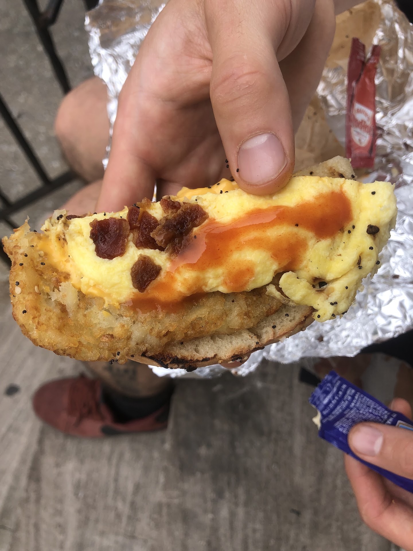 Read moreRead moreTotally DISAPPOINTED ! I’ve followed the comments and honestly they are lies ! Just ordered 2 bacon egg and cheese with hash browns with both Mayo ketchup and hot sauce ; end up with 2 bagels with only egg a bit a cheese a tiny slice of hash brown and the tiniest pieces of bacon. Add on that the DRYNESS because of course they forgot to put the sauce, all this on both bagels ! I’m glad I was preventive and took some extra sauce on my way back (on the photo I just added the extra sauce) OVERPRICED and not even able to make a classic… NO SAUCE + NOT ENOUGH BACON — not a BEC! Making the mistake on 2 bagels of the same orders is really not okay ! Never going back...