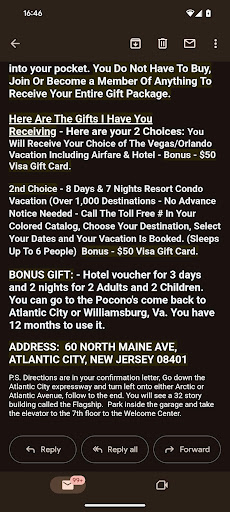 Since we had time to kill on the drive back, we began reading the Terms and Conditions, and we got suspicious when we realized that to access our prize we had to "activate our package" with a non-refundable fee of $150, when the email they sent us clearly stated we didn't have to spend any money to get our gift. Then we had the great idea of googling this company before spending any money, only to find out they thrive on selling cheap package deals you cannot cancel, reschedule, or get back; that you are spending your vacations exclusively at timeshares; that you're signing the fine print that states you have to purchase a certain amount of packages a year that you WILL be charged for regardless if you use them or not; all with the perks of escalating hidden fees. If you have the time and curiosity to fall on this rabbit hole, simply google "Monster Reservations Group reddit" (and a side note of how truly sorry we are some people are still dealing with these scammers to this day).