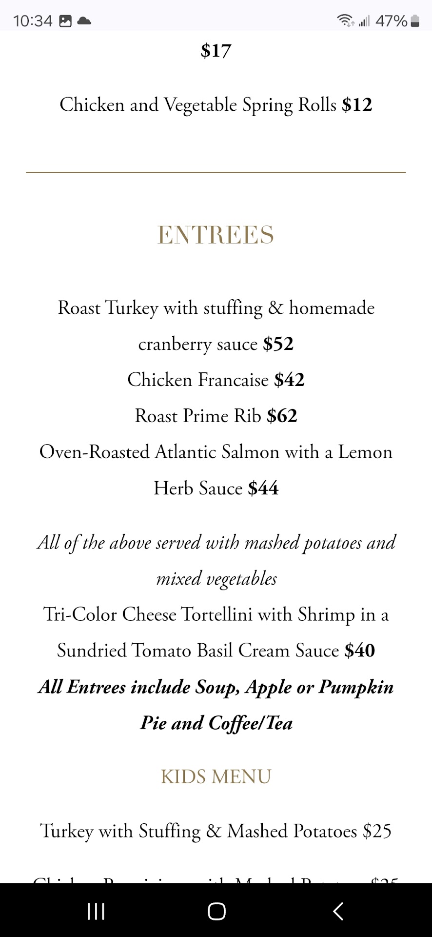Read moreJust had Thanksgiving dinner - very good ( especially the turkey - one of the BEST I've had ) sorry I forgot to take a picture of the turkey plate that included a very nice portion of perfectly sliced, ( thin, but not too thin & NOT thick ) very tasty & moist, light & dark meat, over stuffing ( served with yams, mashed potatoes, string beans & julienne carrots ) just the right amount of gravy & a fresh cranberry sauce. The traditional dinner included a VERY fresh winter vegetable soup with bite size chunks of squash & I think pumpkin in a very nice light broth. Also started with crab cakes & egg roll appetizer - both very good. Finished with pumpkin pie for dessert - the crust was PERFECT, although I didn't care much for the filling - the texture & consistency were good, but not very sweet, nor with the usual light pumpkin pie spice flavors ( my personal preference has always been a pumpkin filling / pudding that my mother used to make - a little on the sweet side ) Overall, very nice & only the 2 nd time I'd been here ( last time was for a baby shower, about 10 to 15 years ago ) PS : I know you don't decide to go to a restaurant for the restroom, but as a lady, it's just an added bonus that the ladies' room is...