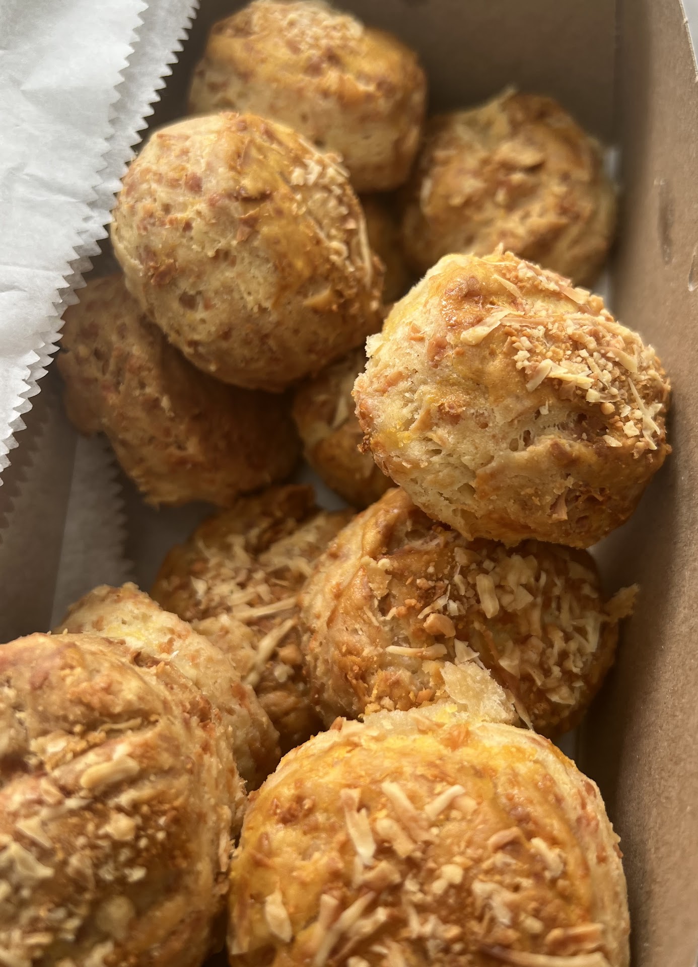 – Freshly baked cheese puffs – warm, flaky, and truly god-sent. Buttery in all the right ways, and melting on the tongue. – Apricot tart – delicate, lightly sweet, and balanced with a quiet tartness that lingered. – Raspberry & chocolate cookie – a bold, chewy delight with just enough depth to feel indulgent. – Spinach and feta pastry – savory, comforting, and perfectly crisp. – A flat white and iced americano – both brewed with a clear attention to quality and taste.