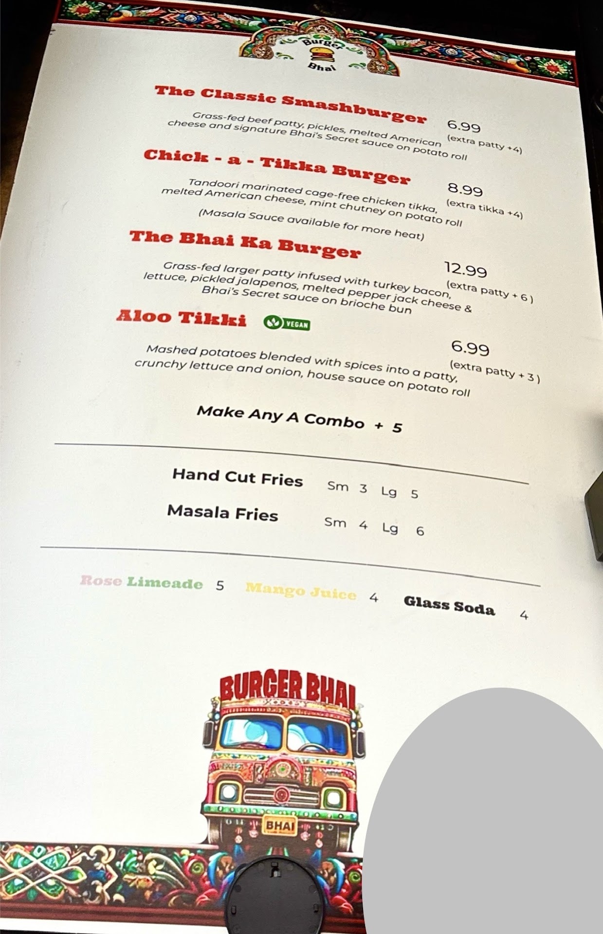We ordered: Masala fries Bhai ka burger Classic smash Bogo smash (without realizing bogo smash is same as classic smash, you just get 2 of them - smh) Chapli burger (didn't know it's chicken chapli) Chick a Tikka burger Aloo Tikki burger Rose shikanjavi Mango shake Bhai sauce Mint sauce Totaling up to $95 and change.