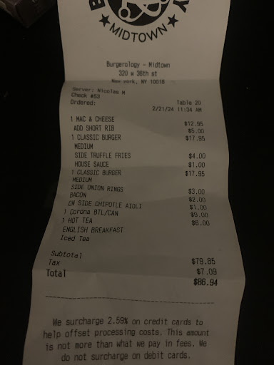 This is where the disappointment happens. To start off with there was only about 3-4 other tables there with us and they were already eating so you would think service would be pretty quick. We waited about 45 mins for our food and we ended up getting all our food together at once (the appetizer and the 2 burgers) Both the burgers were asked to be cooked medium and both came out well done The burger was very thick and stocky which wouldn't be a problem if it was cooked to our ordered temperature and if it was even seasoned a little. The most bland burger I've ever had in my life. They also put 1 thinly slice of American cheese and must of been made from plastic because that cheese would not melt if you threw it inside of a volcano. I took 3 bits and left the rest of the burger. I'm a huge fan and Mac & cheese. I literally eat it everywhere I go and this one by far was the worst Mac I've ever had. So bland it literally had no flavor to it and the short rib that the server recommended must of been cooked last week because it was rough, tasteless, and dry. We literally left 95% of it still on the plate. At one point my girlfriend took a bit of her burger and as she's chewing she pulls out a strain of hair out her mouth!! We didn't make a big deal out of it and just said to ourselves we hope it came from her and not from the kitchen but it honestly did seem like it was in the burger. At the end we ask for our bill and we're shocked to see it come out to $86. Pretty pricey giving all we had was a Mac & cheese appetizer. 2 burgers. I had a ice tea to drink and my gf had 1 corona. We told the server about the Mac and cheese not being good at all and how the short rib he recommended taste was dry and tasted like it was cooked last week and he could see that almost the whole dish was still on the plate. He said he was gonna bring it to the managers attention and I'm guessing he didn't cause nobody came over and it was still on our check.