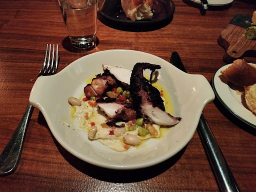 For apps, B opted for the gnocchi mac-n-cheese. My app was the charred octopus with tahini and white beans. Oh, my dear Gd, I was in heaven. From a teensy-tasting bite of the white beans/tahini came such enormous flavor. How did she do that? Octopus is notoriously difficult to get right and easy to get gummy and unappealing. My goodness did this dish G E T I T R I G H T. Wow. Bâs review of the mac-n-cheese: gnocchi done to toothsome turn, with delicious topping, and almost too rich to finish. But to die for.