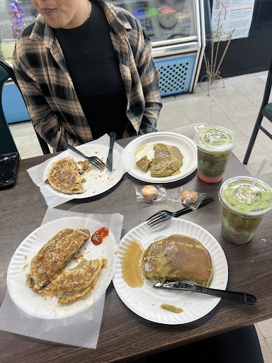 Iâve been walking by this spot for a while now, and decided to finally check it out. My girlfriend and I each got steak, egg and cheese on a scallion pancake and we split the green tea pancakes for dessert. Everything was a 10/10! The scallion pancakes are perfectly flaky, and the cheese perfectly melty. The green tea pancakes are just the right amount of sweet, with a hint of sharpness from the green tea. We also got a couple of iced dirty matcha lattes â hers with strawberry and mine with vanilla. They use traditional Japanese matcha, and you can tell. Again, everything here was a 10/10.
