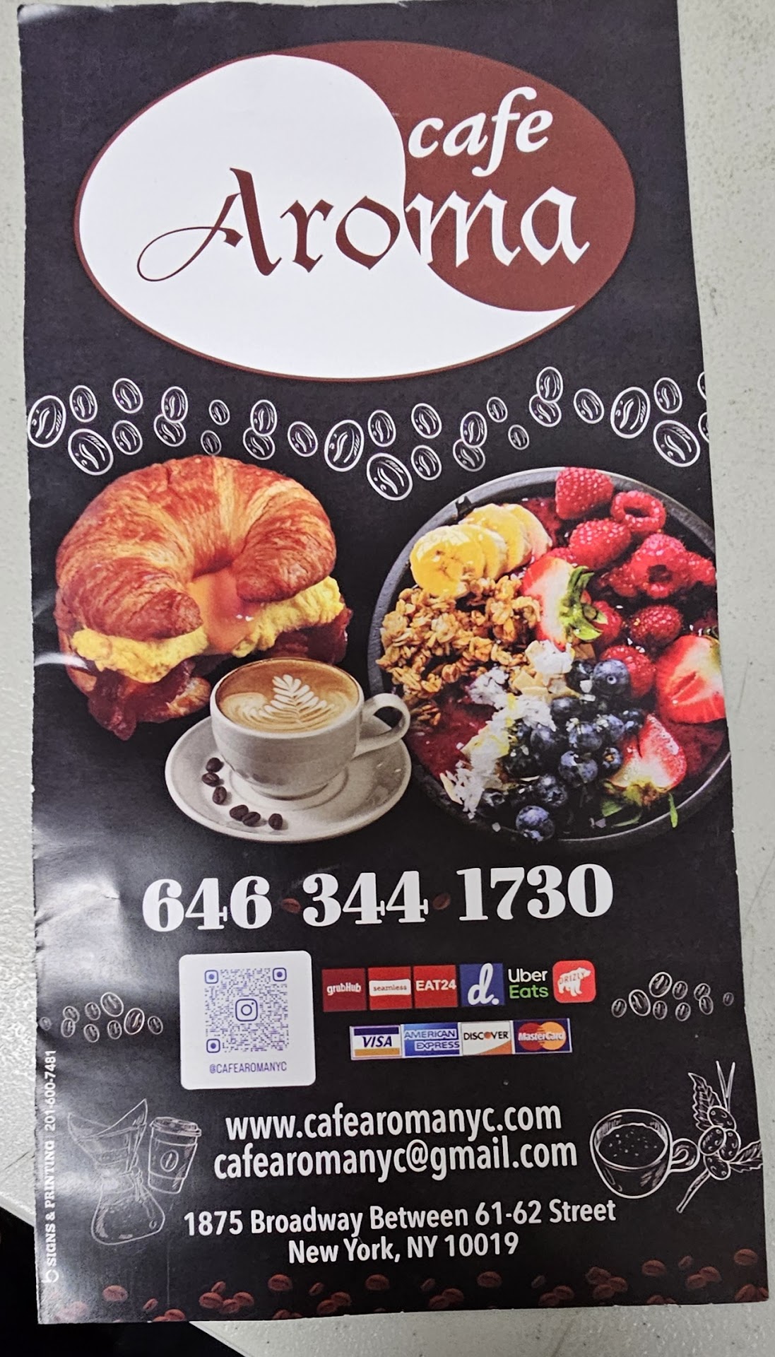 We went up to the TKTS booths at the Lincoln Center to get some more discounted theatre tickets but discovered it was shut when we arrived! - we had made the rookie mistake of not checking their opening times before we set off, which would have told us they are closed on Mondays. We couldn't even get a hot drink in The Lincoln Center lobby like we did on our last visit as that was also closed. We'd passed a very busy bakery cafe on our walk up to The Lincoln Center from the subway station so we went into Cafe Roma for some hot drinks instead. The cafe was very bright, clean, inviting & busy with a steady stream of customers coming and going. My wife had her usual one shot milky latte, which she really enjoyed. I had an English breakfast tea and we shared a delicious traditional almond croissant that had a very tasty almond paste inside, which the very helpful server heated up for us. There are quite a few tables with seating inside the cafe so we grabbed one. There are also a couple of tables on the pavement outside and a restroom at the back of the cafe. All their breads & pastries are baked fresh instore and the different foods in the various refrigerated cabinets all looked very tempting. We would have tried a bagel or sandwich if we weren't heading to lunch afterwards. We returned to the TKTS booths at the Lincoln Center the next day and after buying our theatre tickets we went back to Cafe Aroma for some brunch. My wife had a delicious, juicy & tasty classic Angus beef burger and a strawberry & custard croissant with a cuppa tea. I had a classic sliced ribeye cheesesteak sandwich and an almond croissant with a cuppa tea. The food was delicious and excellent...