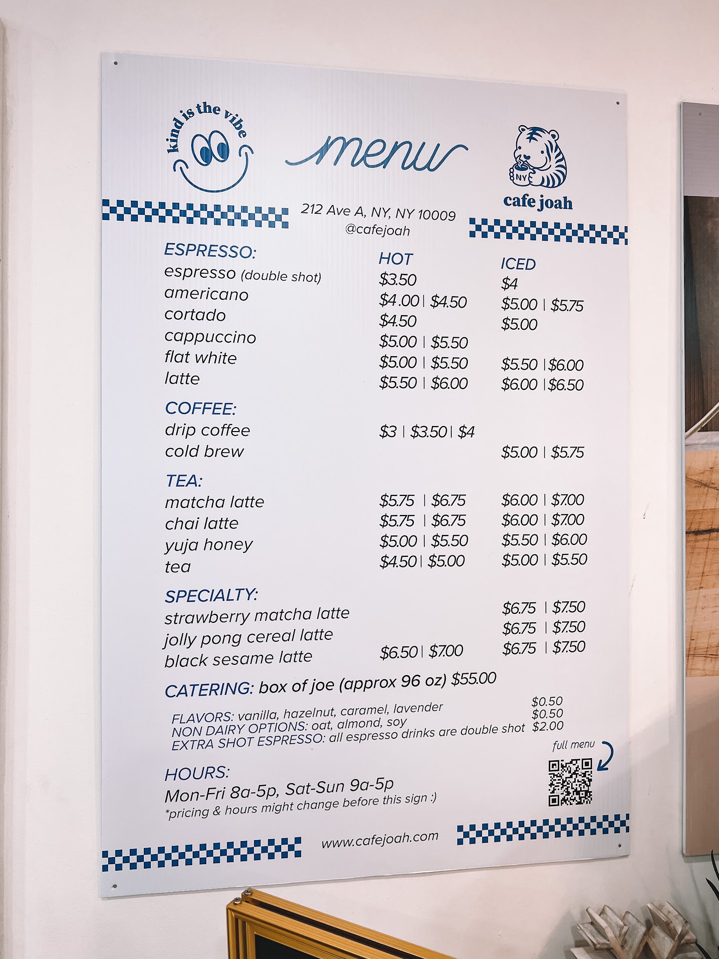 Read moreCafe Joah has recently been added to my morning coffee shop rotation and it's been very enjoyable to have a new spot to go to. Coffee is very good (though dependent on barista) and the space, while small, is a cute little outpost on Avenue A. I do think a few tweaks here or there (new rubber caps on the stools to make it less metal-on-tile, jacket hooks under the window counter) could up the vibe of the space from very good to great.