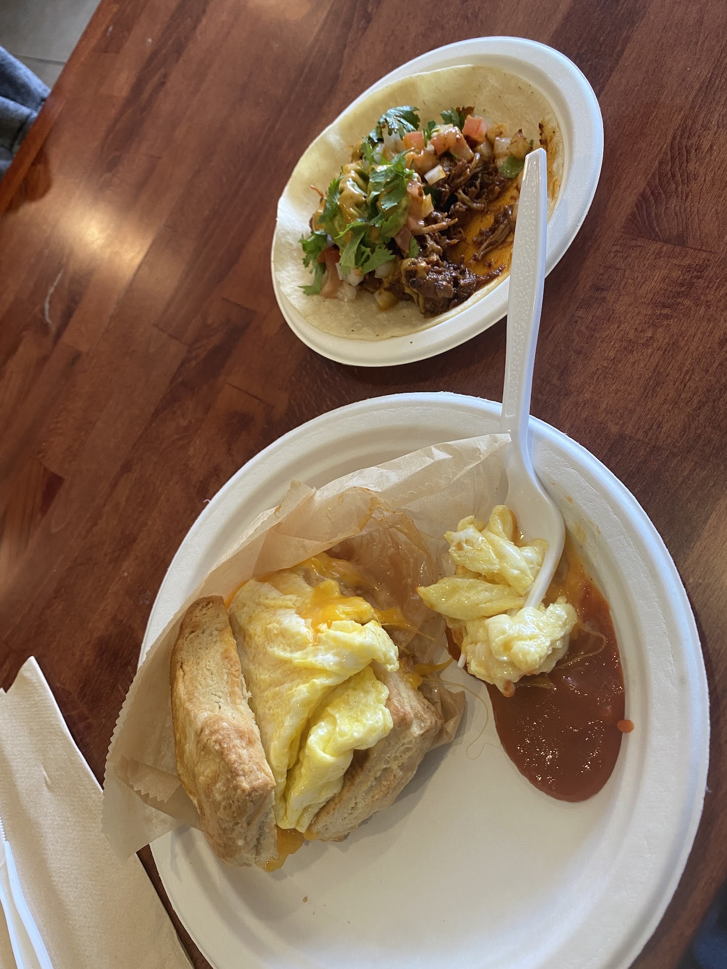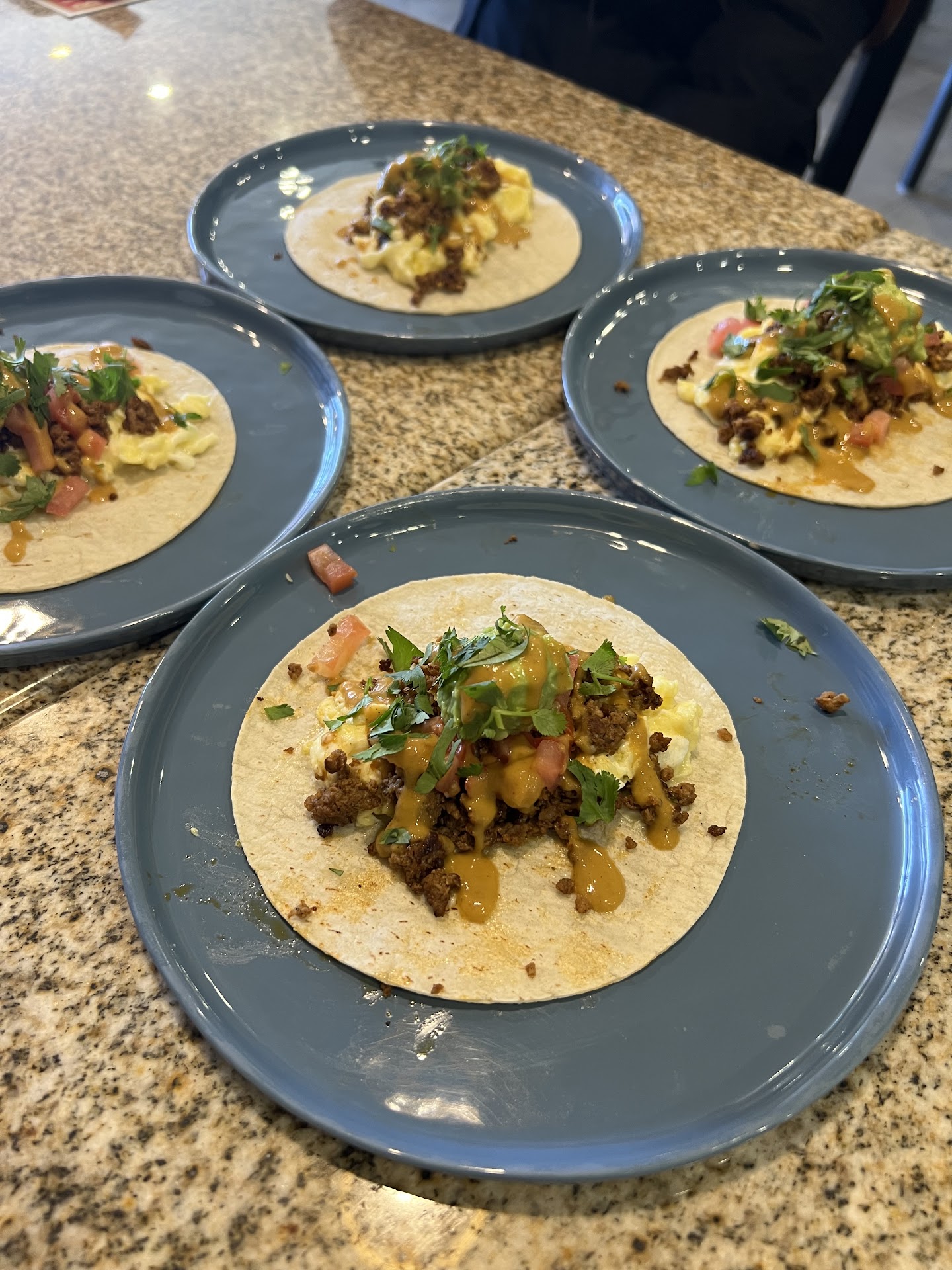 Reminds me of a easy coffee shop similar to Starbucks where people eat and stare at their laptops. I ordered the breakfast taco and Korean chicken taco. Both tacos were well stuffed. The breakfast taco was delightful with egg cilantro and a bit of chorizo. The Korean chicken taco was well stuffed, tasty and filling. I'm stuffed from these 2 tacos. Yummy. Prices are reasonable. Atmosphere is clean and I think it's fairly new. You order and take a seat. They bring food to your table. There is a water dispenser for free glasses if water. No frills. Paper plates, plastic utensils and napkins. I will be back for sure and try the quesadillas and...