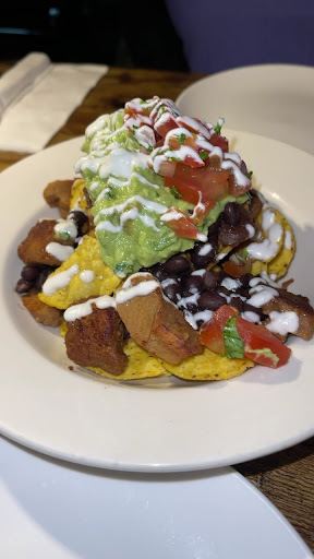 Now onto the food. The Tapas sampler arrives first, we get it with sourdough. It was absolutely delicious. The Ali-oli was our favorite. We devoured it and the only thing we didn’t like was the smoked eggplant it was absolutely disgusting, but none of us are really fans of eggplant to begin with. The nachos are a nice size, the chips are a bit soft so they break. We just decided to eat it more so with our forks. Still delicious.